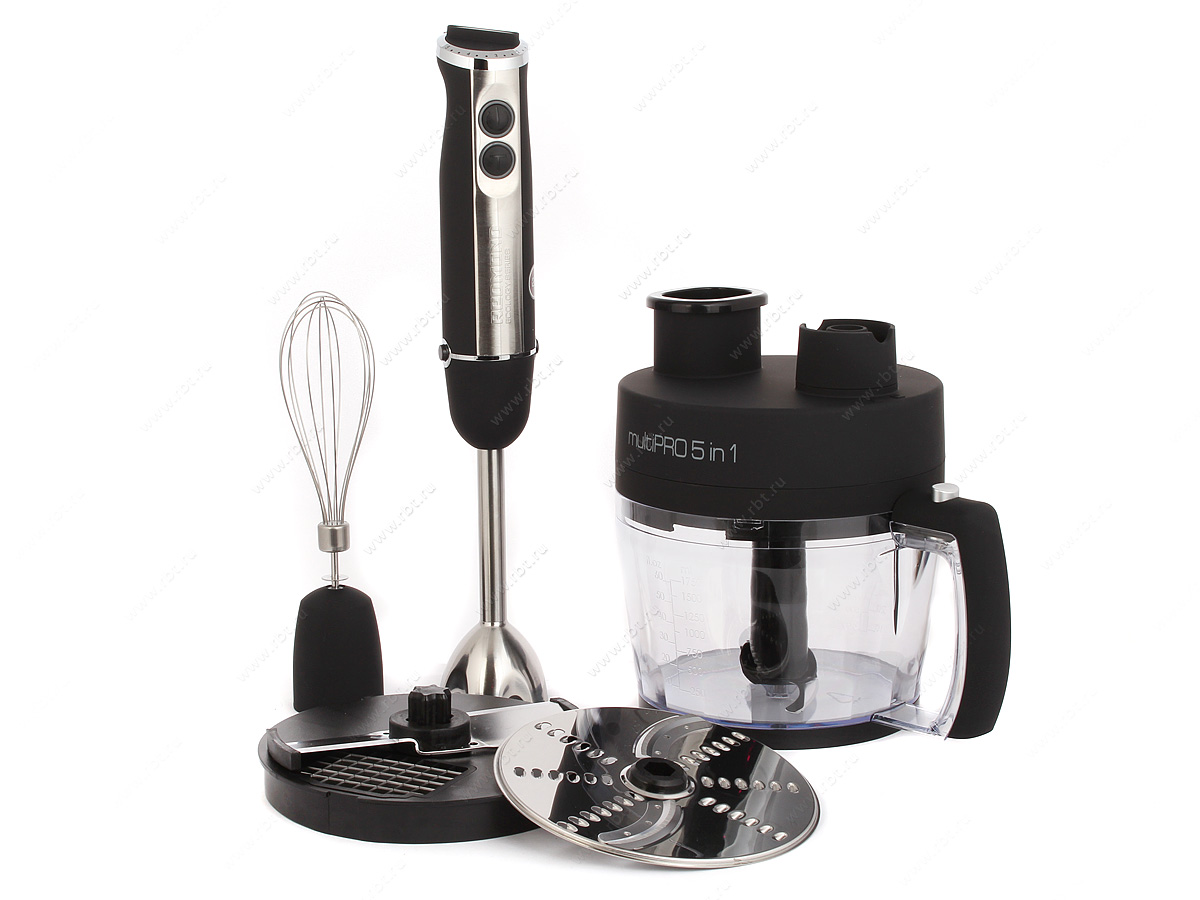 One of the most expensive models of the brand. It features a rich set, which, in addition to the measuring cup and chopper, includes several additional nozzles for slicing vegetables, dicing and grating.