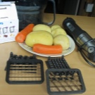 The design has a very nice design, easy to use and has a budget cost. This is where the pluses end. Is it only pleases additional nozzle for cutting vegetables in cubes. The model works with some stretch, as the knives are made of metal, which quickly becomes thinner, and the blades become unusable.