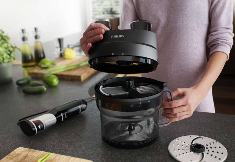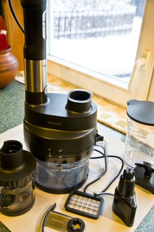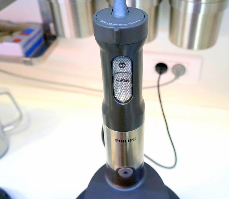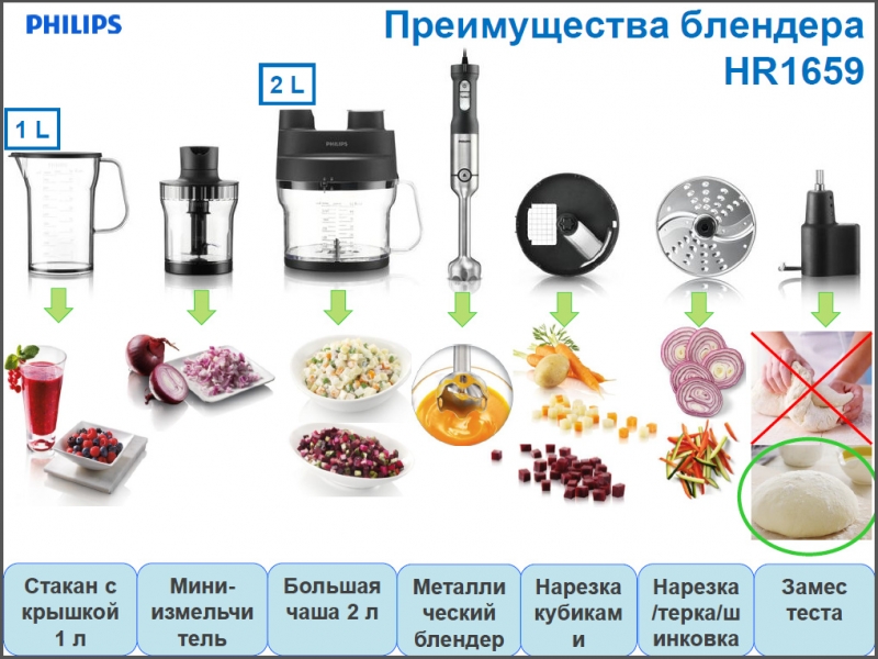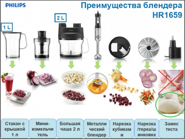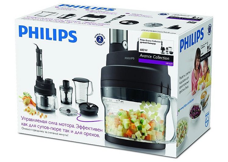 It is the most popular and best-selling blender model. For buyers, it is in special demand due to the optimal ratio of price and quality. Thanks to the additional nozzle, with the function of special cutting, it is possible to grind products into ideally even cubes, eight millimeters in size. Model HR 1659 is ergonomic, and almost all parts can be washed in a dishwasher. As a vegetable cutter, it copes with almost all products - from boiled eggs to cheeses and cooked products. However, for processing carrots, or beets, raw, the device must be turned on at high speed. The disadvantage of the reviews, this model is the lack of a whisk.