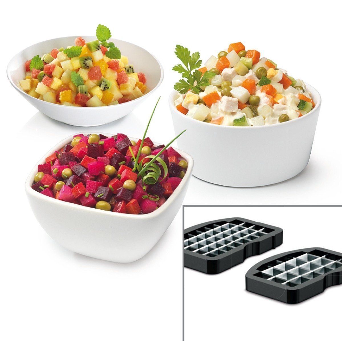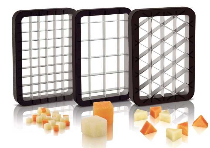 The device with additional blades copes with the grinding of fruits, but is also suitable for vegetables. There are several types of materials from which there can be an additional nozzle for cutting cubes: