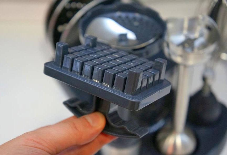 As a rule, diced blenders are rarely made into cubes. You can buy the nozzle separately, and its cost depends on the material of manufacture and the brand of the manufacturer. By itself, it has an elongated shape with metal plates stretched up and down: passing vegetables and fruits through them, grinding into cubes takes place.