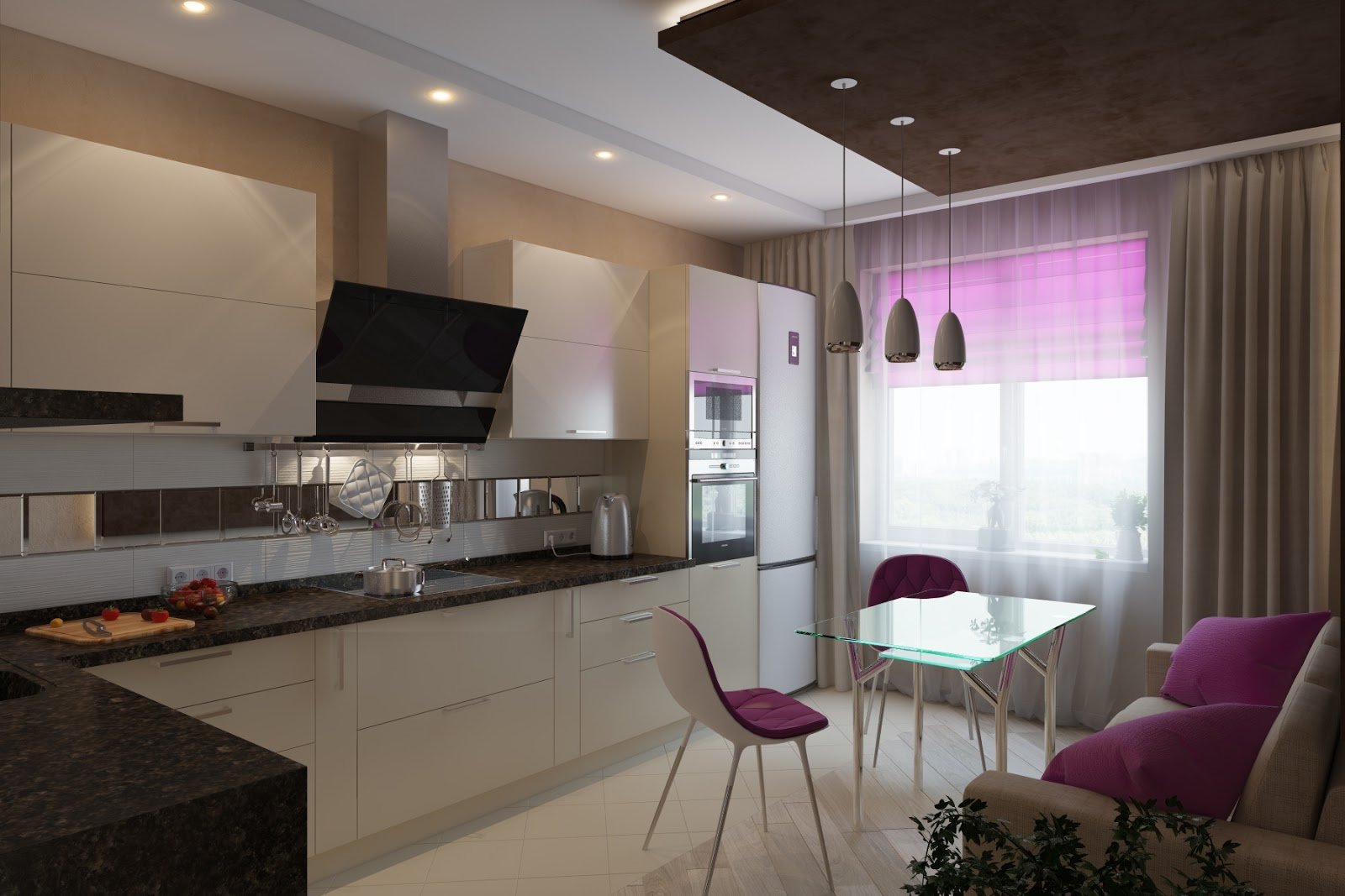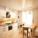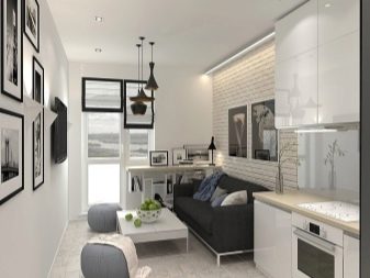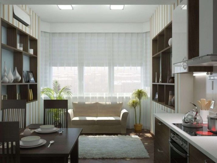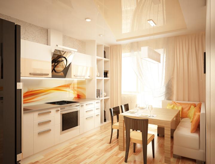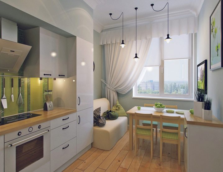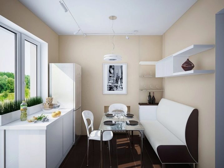 A rectangular laconic sofa of classic pastel or fashionable motley colors will safely take root on the minimalistic kitchen area.