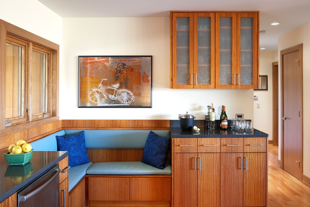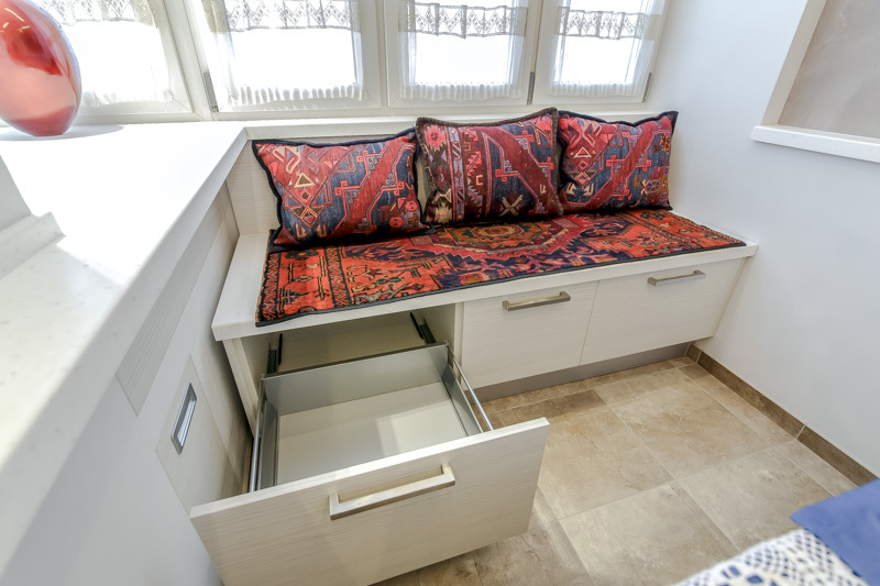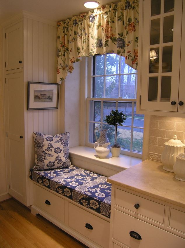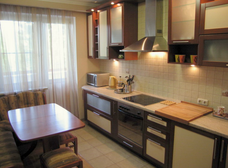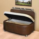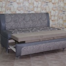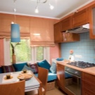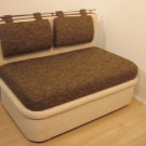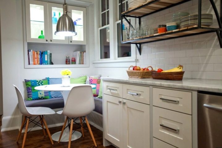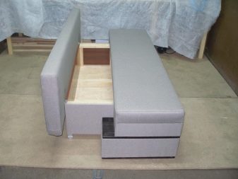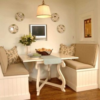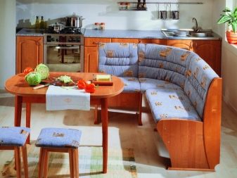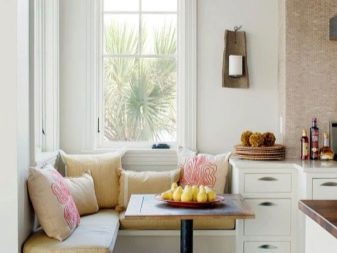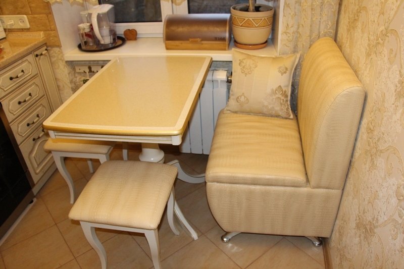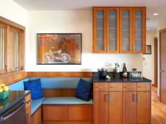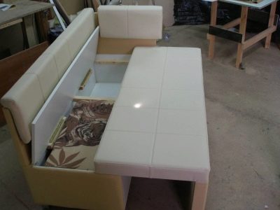 The most comfortable and practical - sliding sofas with a folding bed and soft springy upholstery made of teflon-impregnated artificial fabrics. With ease they play the role of a comfortable seat, a full-fledged berth, and a spacious storage system for cooking equipment and home-made food products.In addition, they do not absorb smells, fumes and pollution, are not afraid of the high humidity of the kitchen area, do not require special care and are easily repaired.