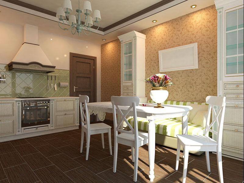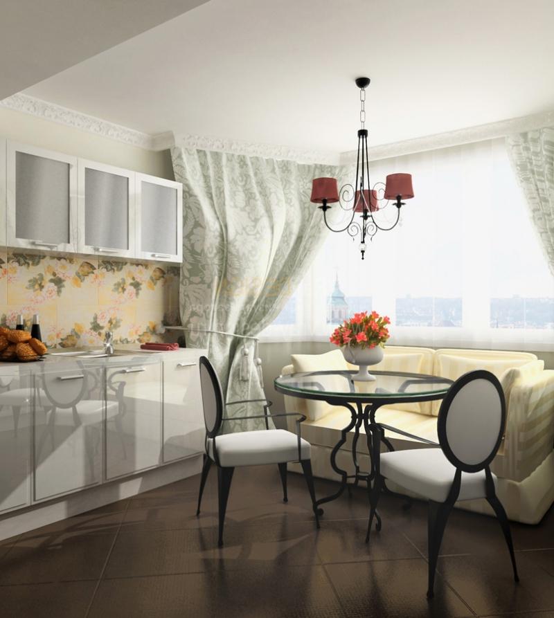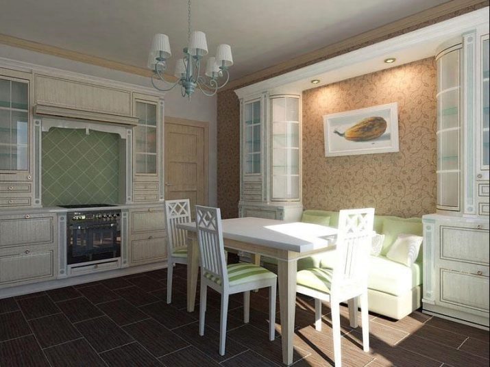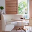 The classic kitchen will suit a rounded sofa with a monochromatic beige upholstery or vice versa, with a printed pastel color and a floral print, cheerful polka dots or a square.