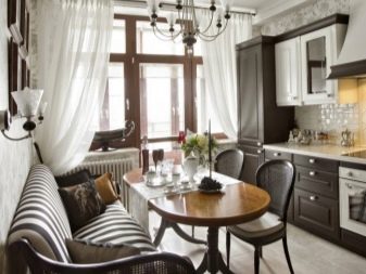 The kitchen, decorated in a difficult art deco style, will decorate a small sofa without handrails with a high back and a curved seat, covered with bright luxurious velor.