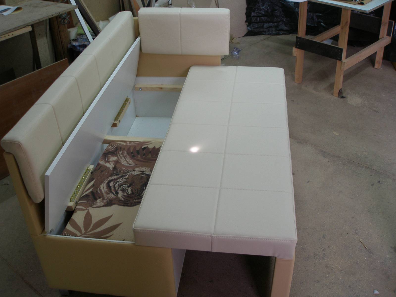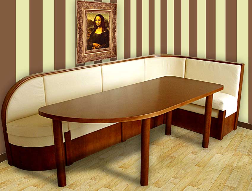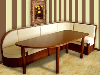 The most durable, reliable and durable, but at the same time the most expensive and requiring special careful care - a kitchen sofa made of solid wood with a leather seat and backrest. Its upholstery made of leatherette or stretched over the backs and seats of eco-leather will cost much less, but they are unlikely to last for several decades without losing their appearance and without restoration.