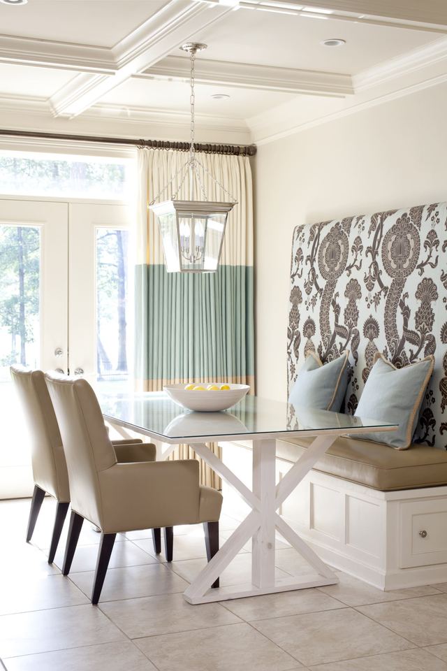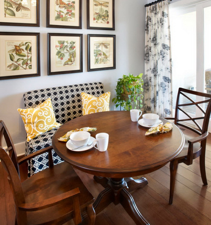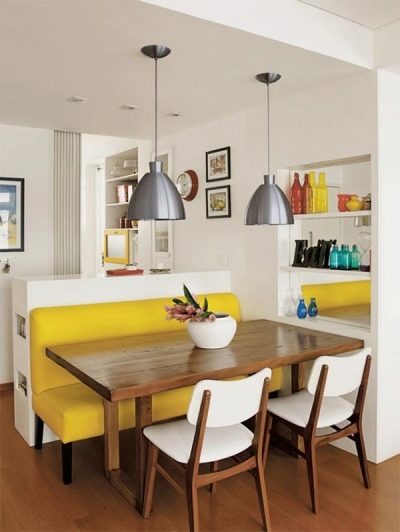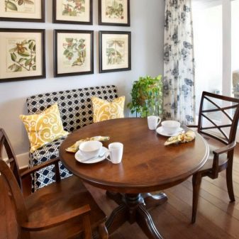 A cozy dining area does not make sense without a comfortable table and the shape and dimensions of the sofa that fit it. By the way, he is fully capable of replacing all the added stools and chairs, or being supplemented by them with an increase in the number of companies and the availability of free space.