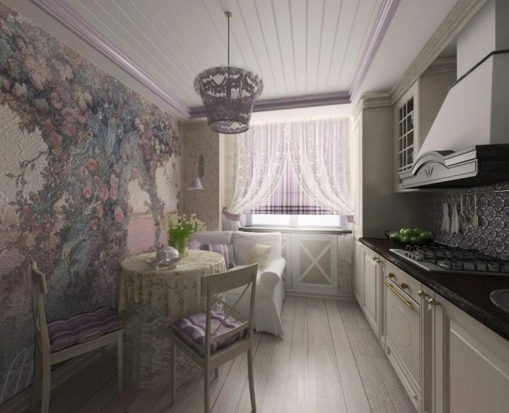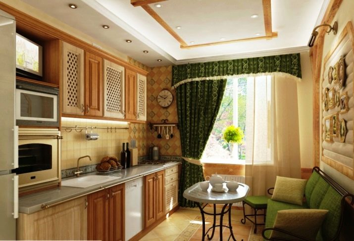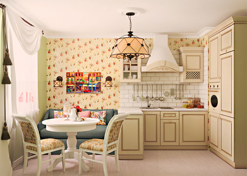 In the Provence or Country style kitchen, a compact sofa with wrought-iron wrought-iron details or carved details will look good.