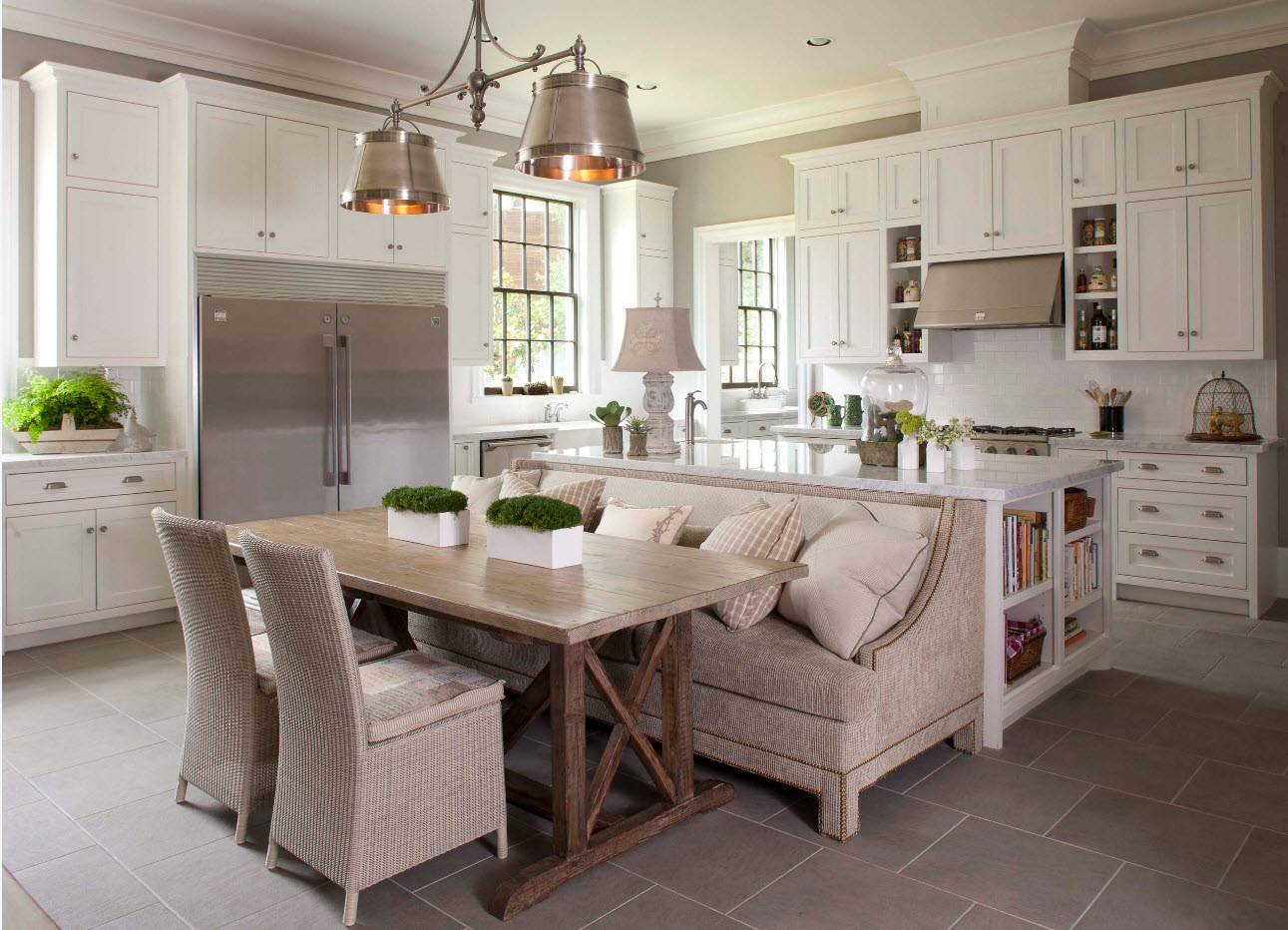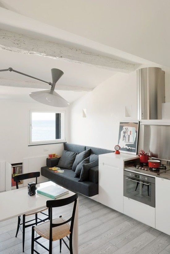 A Scandinavian or Mediterranean-style kitchen requires white, gray or the color of an unbleached linen woven upholstery on a small sofa.