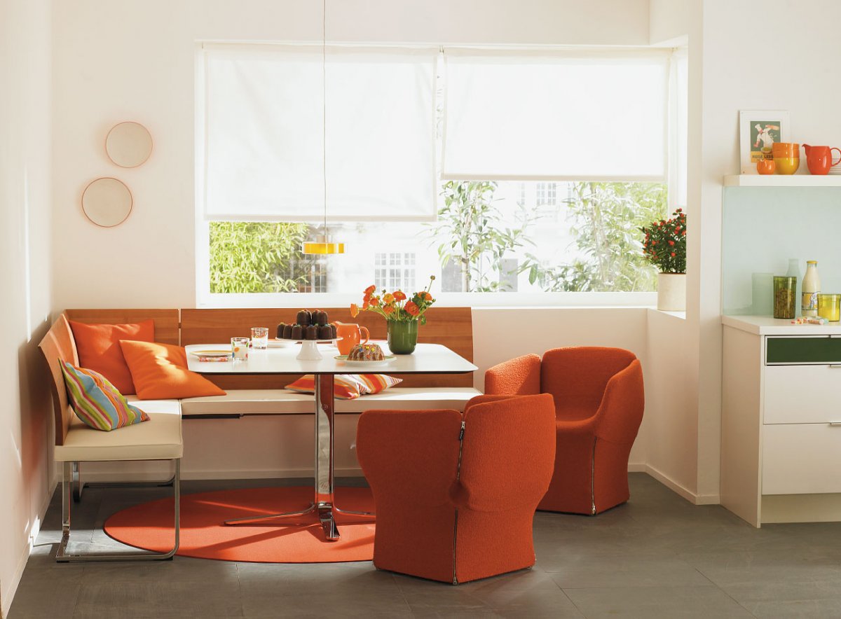 The color solutions of kitchen sofa groups are as diverse as the versions of their designs and upholstery materials. Surprisingly, even a white little sofa can take root in the kitchen. And not only if it is made of wood or metal and just painted white,but also when it is upholstered in modern smooth, textured or even fluffy ultramodern materials that are perfectly able to repel pollution and moisture and are not at all afraid of soot, greasy spray, chemical and abrasive cleaning products and temperature changes typical of all kitchen areas.