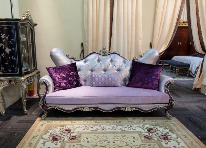 The kitchen area in the fancy baroque style will make friends with a compact sofa with a four-sided carriage visor on velor or leather upholstery with natural hues or bright extravagant prints.