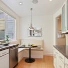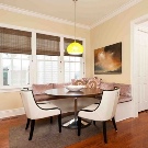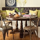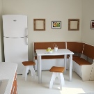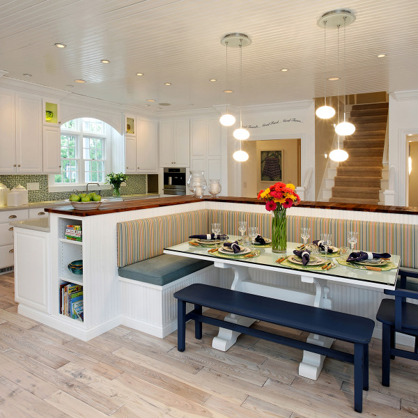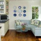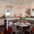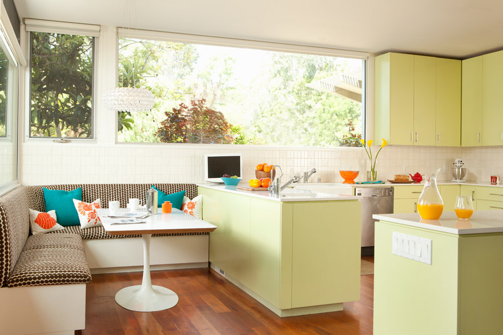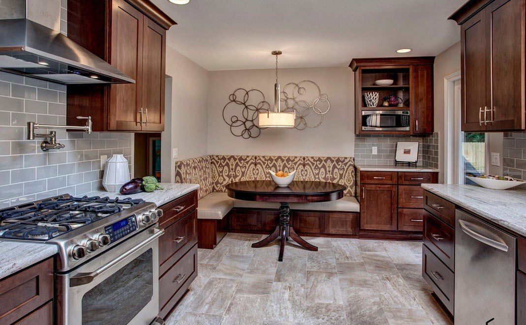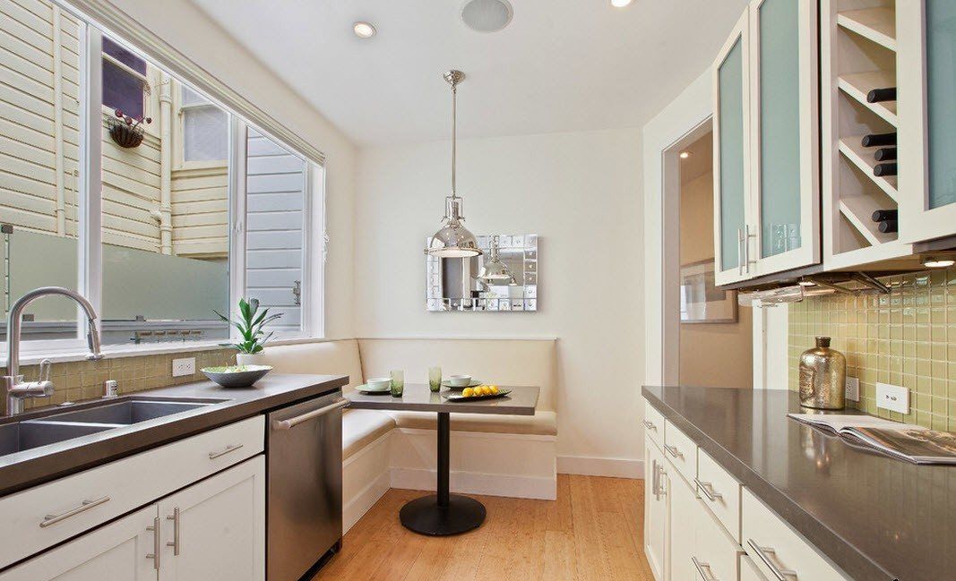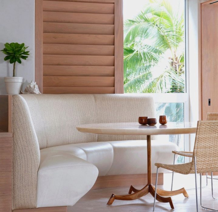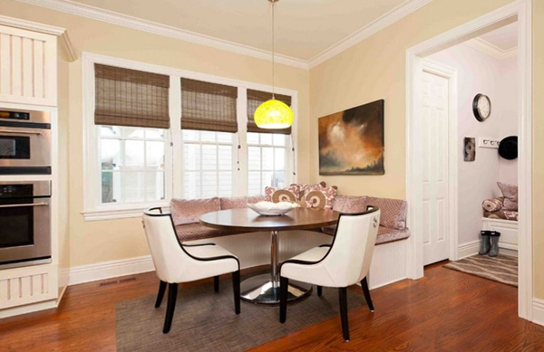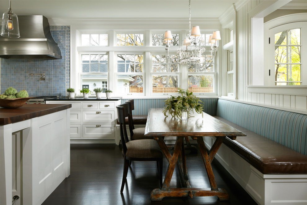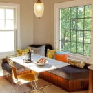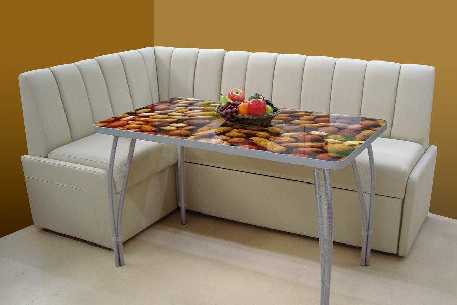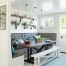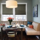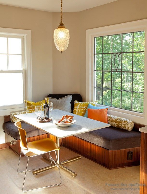 Most often, this piece of furniture is placed at the kitchen window, in the corner adjacent to it. The sofa has a dining table and thus, this place turns out to be a full-fledged corner where the family can relax or have lunch. In this arrangement, the corner designers see some advantages.