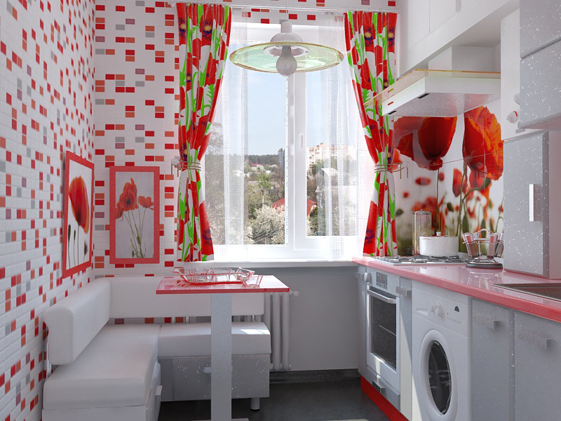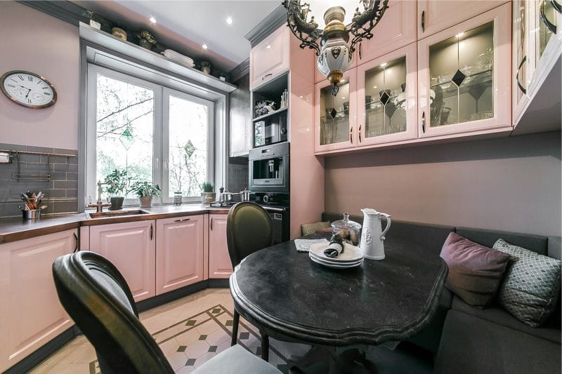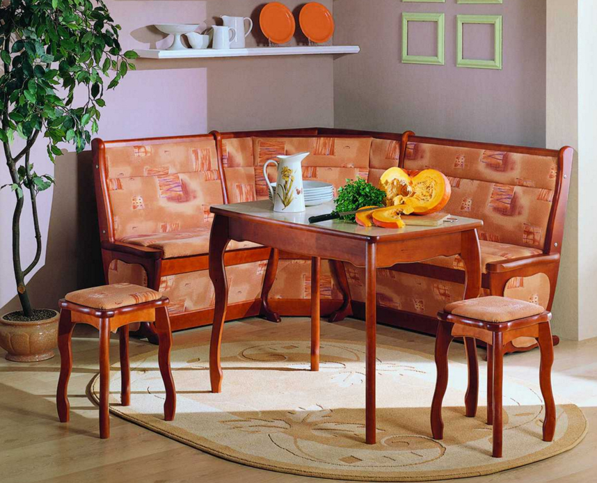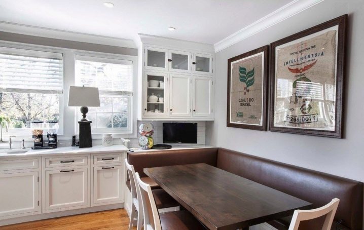 This and the sun, which, looking into the window, comfortably illuminates the table, and the view that opens from the window and pleases the eye. Moreover, occupying a corner of the kitchen, this piece of furniture saves much kitchen space. The best effect can be achieved if the sofa is in tone in contrast with the color of the wall.