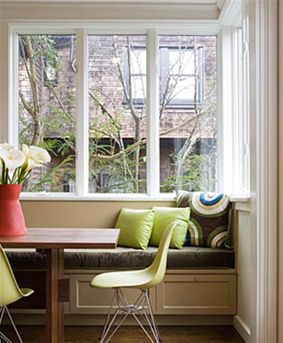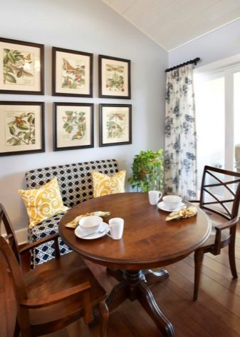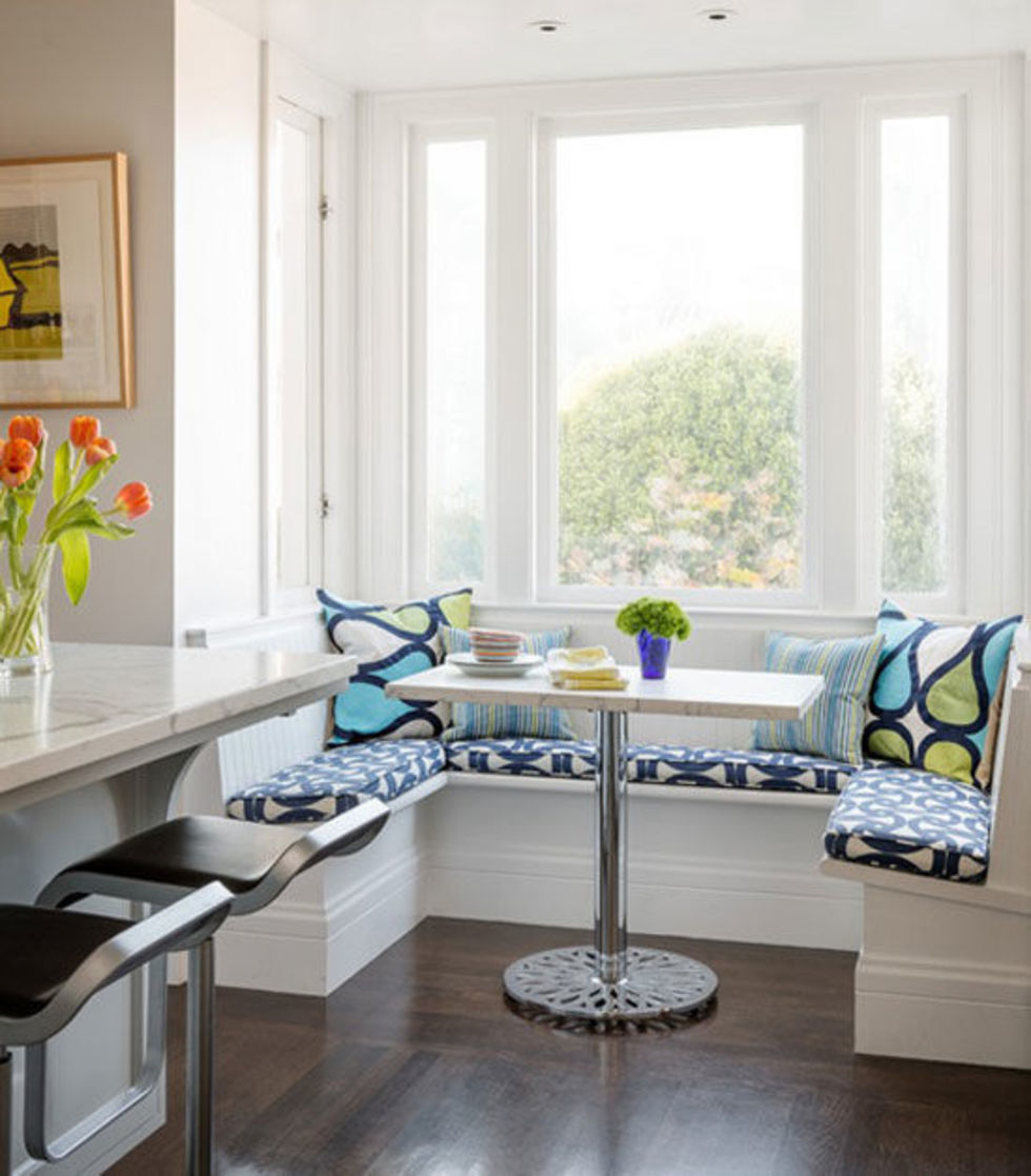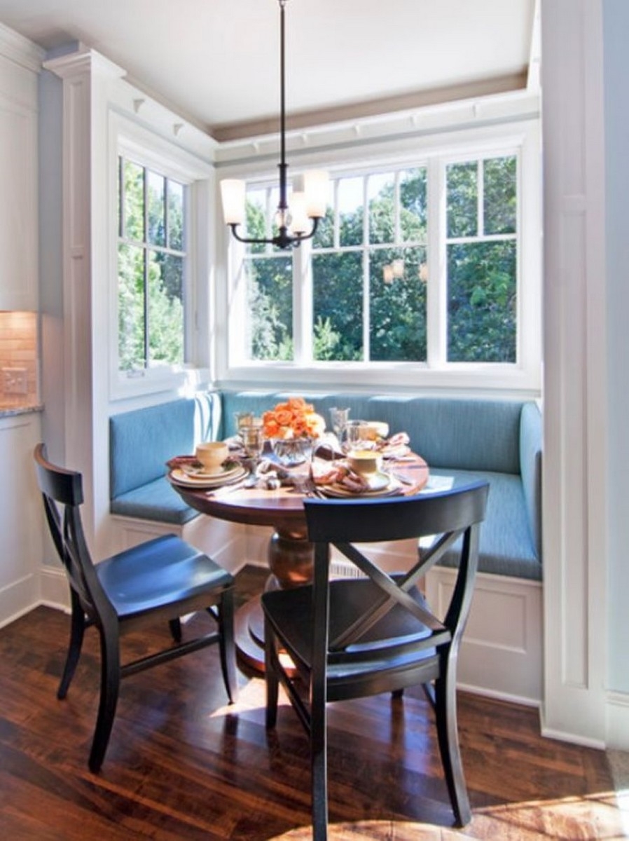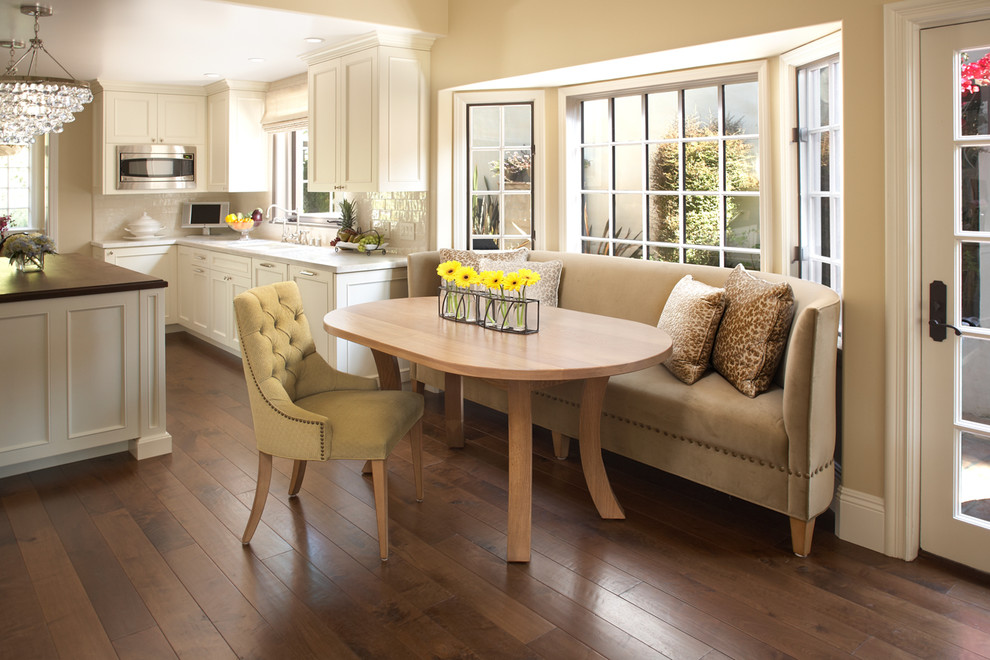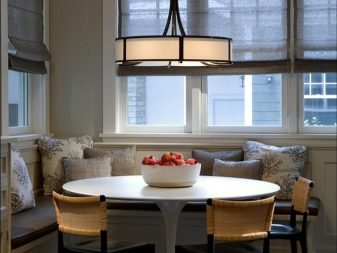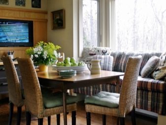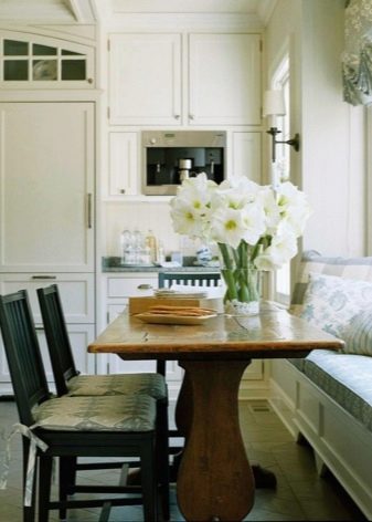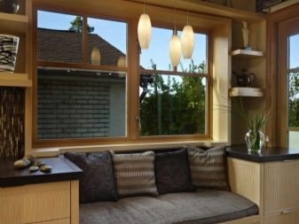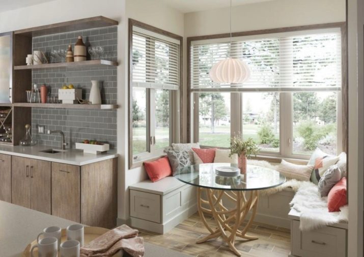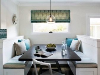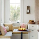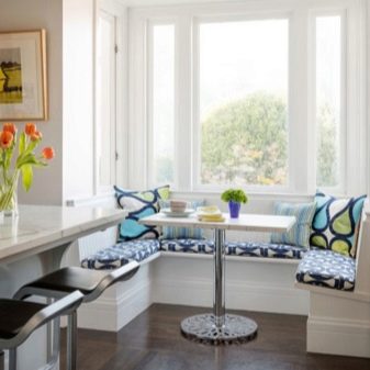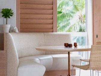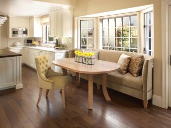 Bay window - a design that is made to order to fill the empty niche under the window. It can be rectangular, semicircular or irregularly shaped. By means of a bay window sofa the free space is filled to the maximum. Upholstery such a model, choose a light, delicate shade.If the kitchen is combined with a balcony, the best arrangement of upholstered furniture with a table is near the window. This arrangement will create a comfortable area for eating.