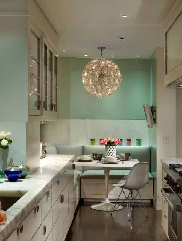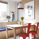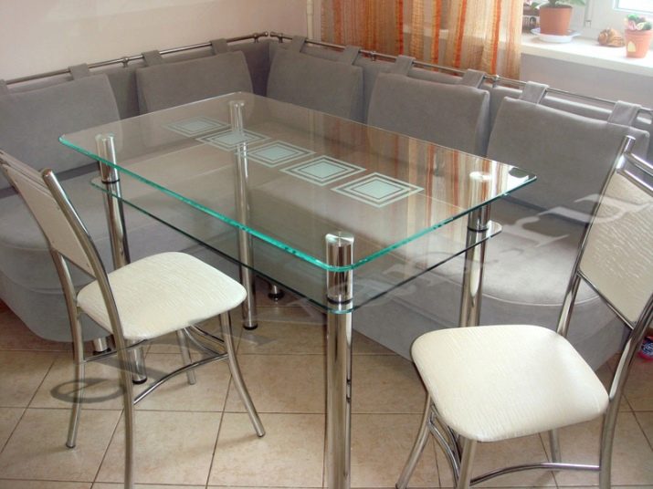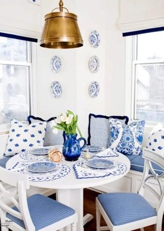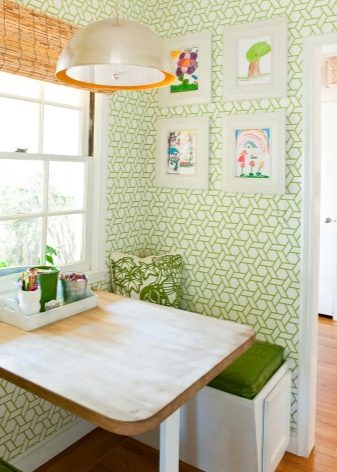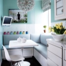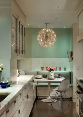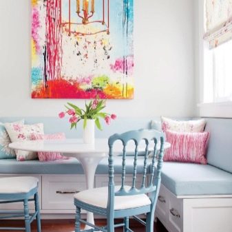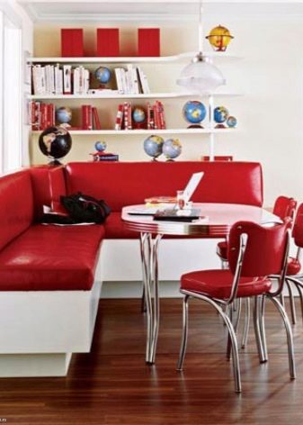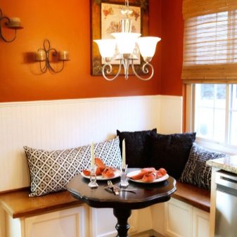 Corner design clearly limits the dining area. In addition, it increases the number of seats. If she has internal drawers and folding seats, they will fit various things. Soft kitchen corners can have an interesting decor, be made in different colors and shades. Overall models are equipped at the head with shelves, which are used to accommodate various accessories.