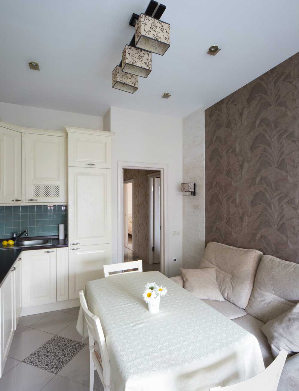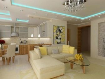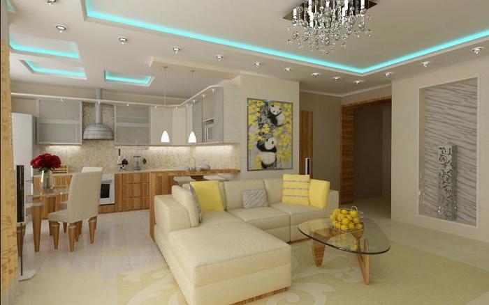 The zoning of the room with the help of an angular design looks beautiful and original. Designers recommend installing furniture in the center of the room, rather than in the corner, thereby separating the area of cooking and its adoption. Thus, the work area does not intersect with the rest area. For living room 13 square meters. and 12 square meters. meters a good idea for the interior can be a constant classic or project in a modern style. The layout of the room for classic furniture is standard. The working area and the dining area do not intersect, but can be visually separated from each other not by a soft sofa, but by a wall made of plasterboard or curtains.