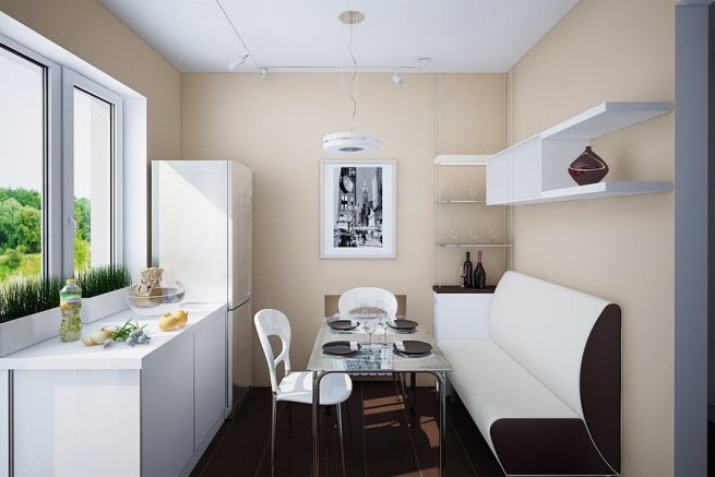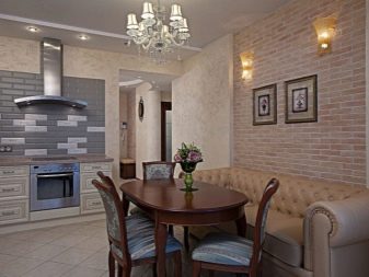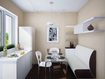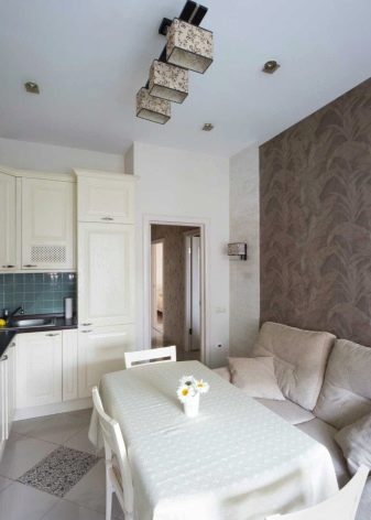 The area of the room is 9 square meters. m., accommodates a comfortable sofa that can be put along the wall. Individual projects allow you to place in the room any functional items, including a cozy and comfortable design. Designers advise when choosing upholstered furniture for the kitchen to pay special attention to the material and color of the product. A small room will be decorated with light models that can be protected with a cover.