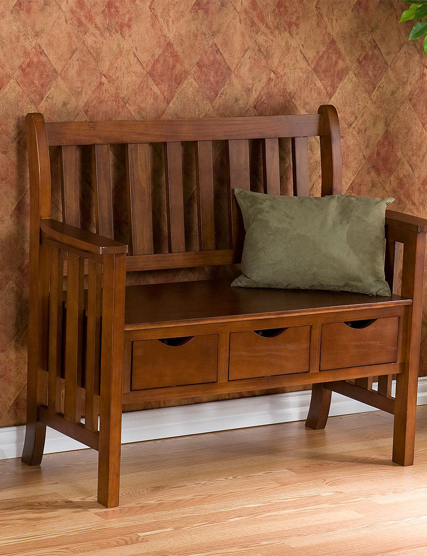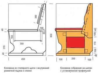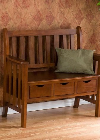 The first stage is the connection of three parts (sidewalls, backs and seats). Prepare in advance the bars of the required length, with a section of 40x40 mm. A functional and durable design will help make roomy drawers that should be placed under the seat. For this you will need boards. Lay on the bottom of the plywood, which should be inserted into the cut grooves. The remaining elements of the structure must be connected with self-tapping screws, and the holes must be closed with plugs.