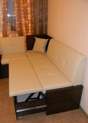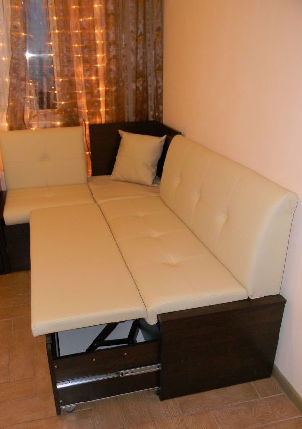 Today there is a huge species variety of kitchen sofas. Folding design - multifunctional. Used as a bed for guests, so popular among buyers. Takes up little space and is considered an excellent alternative to folding beds. Folding model can be straight or built into the corner.