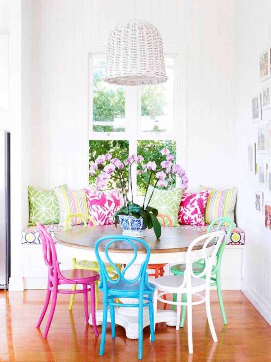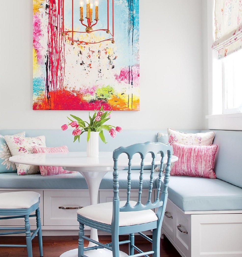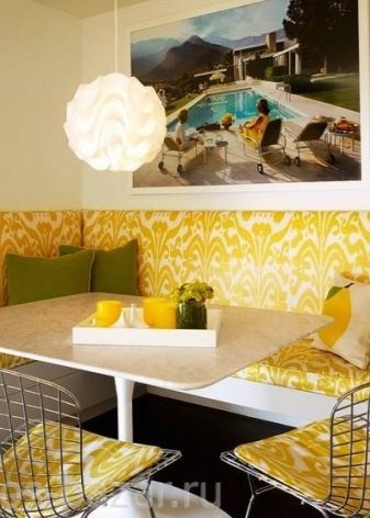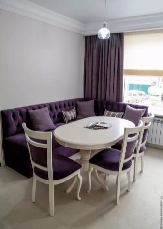 A bright upholstery print, a geometric pattern, a strip will suit for a monochromatic room. At the height of fashion today is purple. For furniture it is best to choose a synthetic filler. The combination of contrasting furniture and light walls looks beautiful in the room. Designers advise to pay attention to eco-style, Scandinavian, hi-tech, loft. These styles are softened by a soft kitchen sofa, which will look appropriate in the dining area.