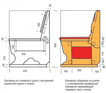 The sides are connected using horizontal bars, then the back frame is made of plywood.At the final stage it is necessary to attach foam rubber. The seats consist of 2 parallel and 4 perpendicular boards, which are connected by special spikes, and the trim is made with a plywood sheet. The longitudinal beam, located behind, is connected by piano loops. The seat cover should extend 30 mm forward with bolted metal corners of the backrest.