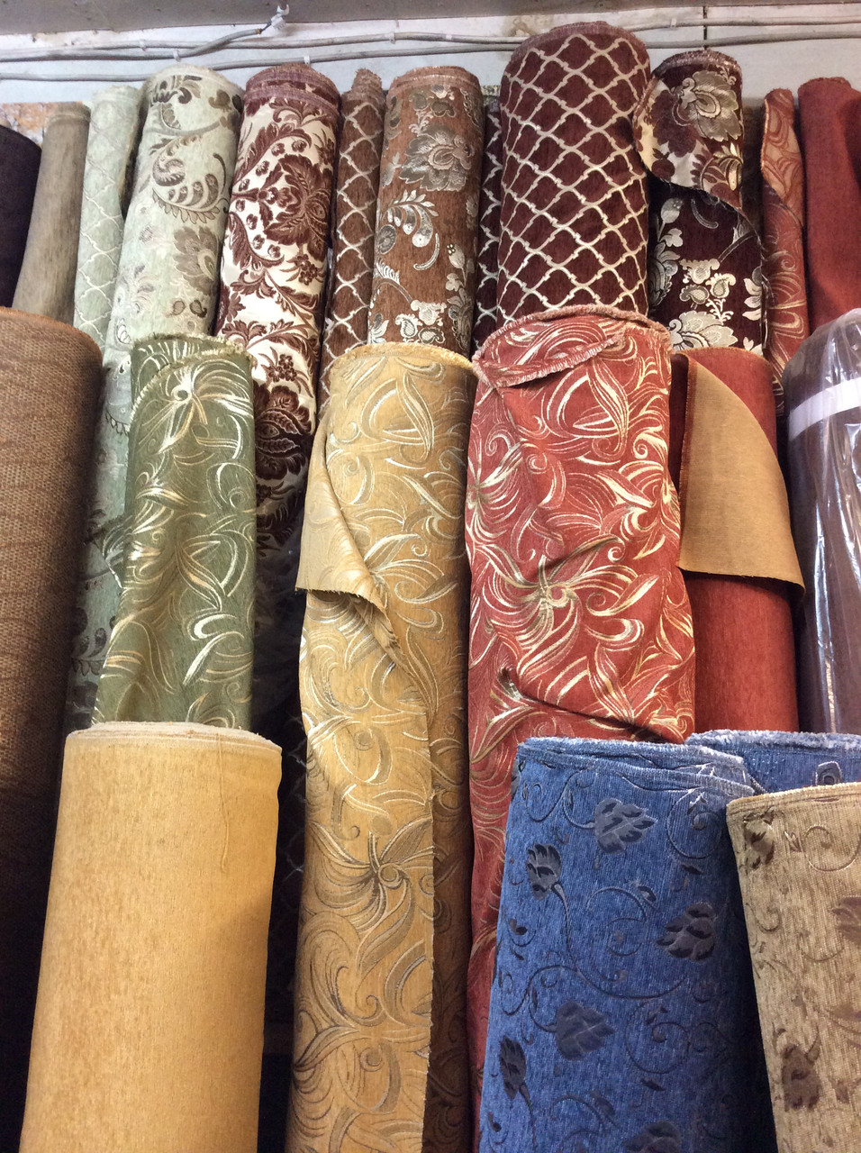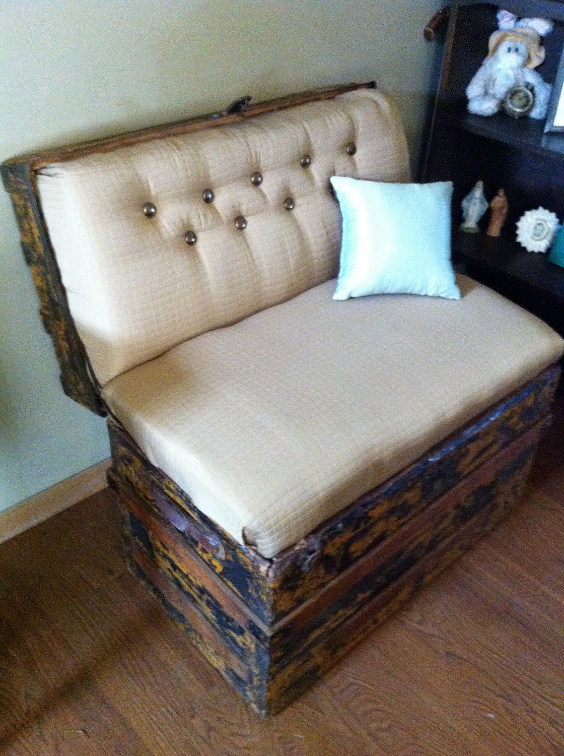 Make a pattern of fabric after accurate measurements, which is transferred to the selected matter. If the structure has open parts not upholstered in fabric, they should be painted with enamel or varnish. Originality sofa will add beautiful plugs for bolts, textiles, soft pillows and other decorative items.