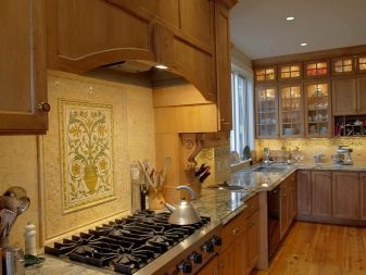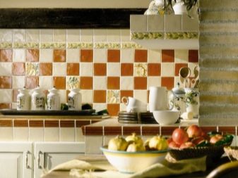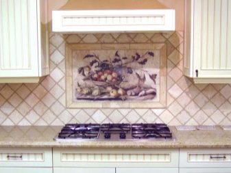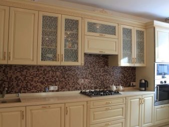 Mosaic looks very expensive and elegant in the kitchen - very small colored squares. It can be quite bright, but its tones should repeat those used in the interior. This mosaic put only experts. For self-laying you can buy large tiles with a mosaic pattern or mosaic on the grid. By the way, it is very popular to use mosaic as an accent: for example, the main part of the apron is lined with large tiles,and a mosaic strip is made in the center.