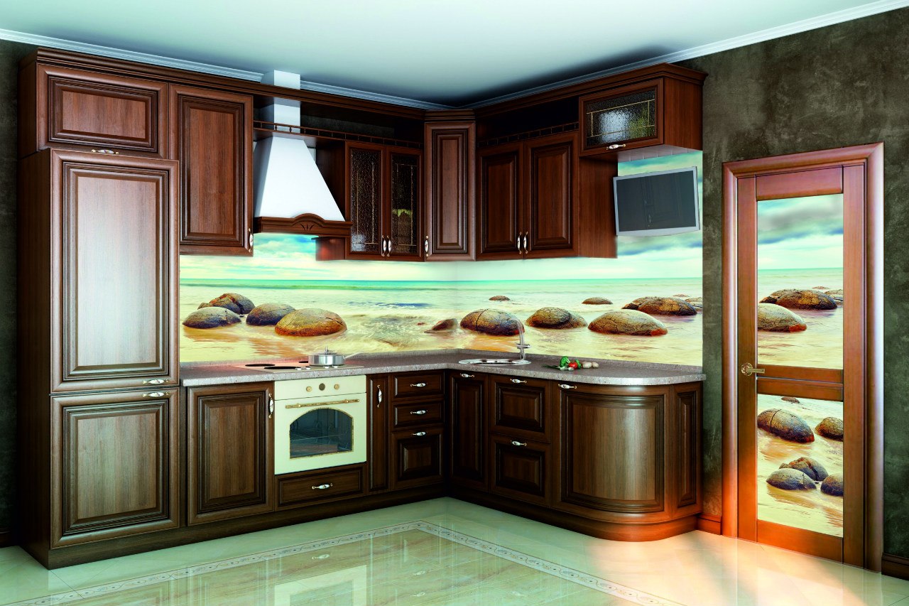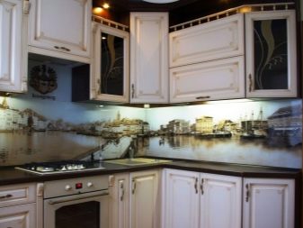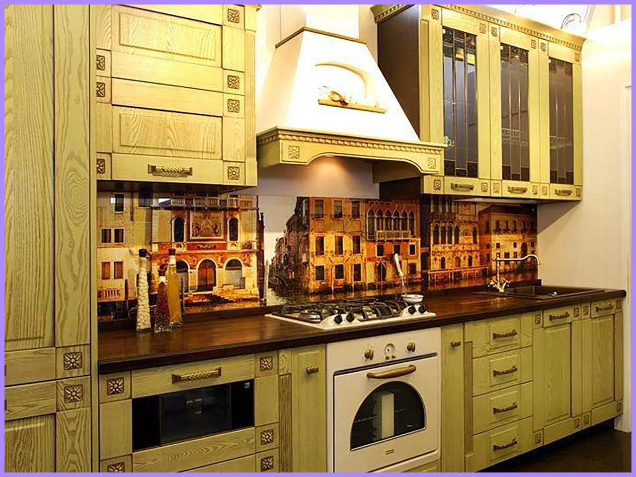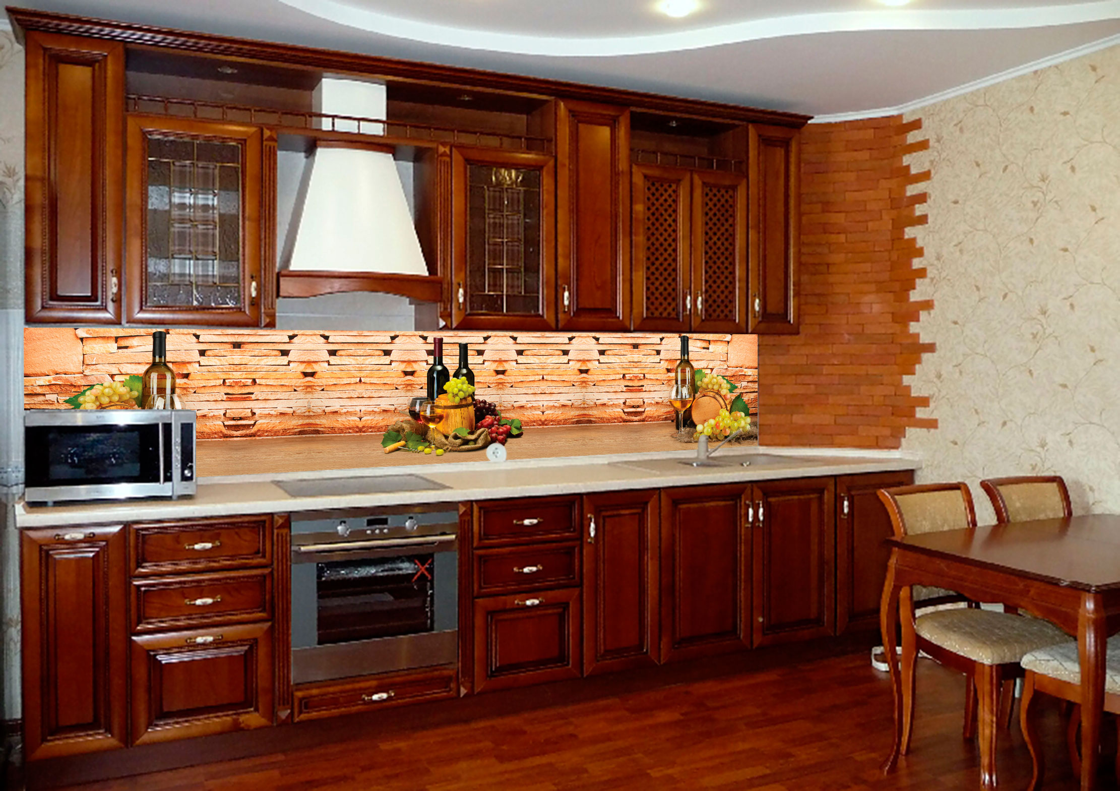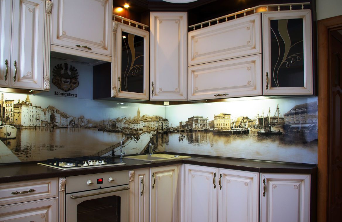 An apron made of glass (it is called “skinali”) looks very modern. In practicality and ease of care, it surpasses all other options! It can easily fit into the classic style of the kitchen. It can be monochromatic frosted or glossy glass, illuminated glass, printed glass. Figure must be selected on the basis of the general concept of design. These can be flowers, landscapes, large photos of products or spices, “aged” and retro pictures, written inscriptions, etc. To make your kitchen in a classic style unique, you can make skinali with your own photos or other images that are dear to you personally.