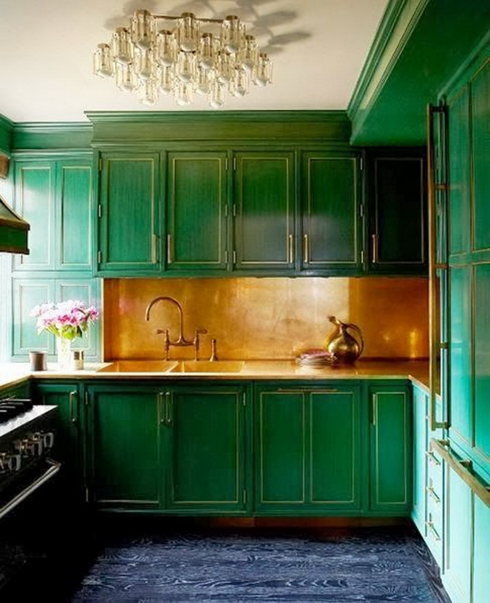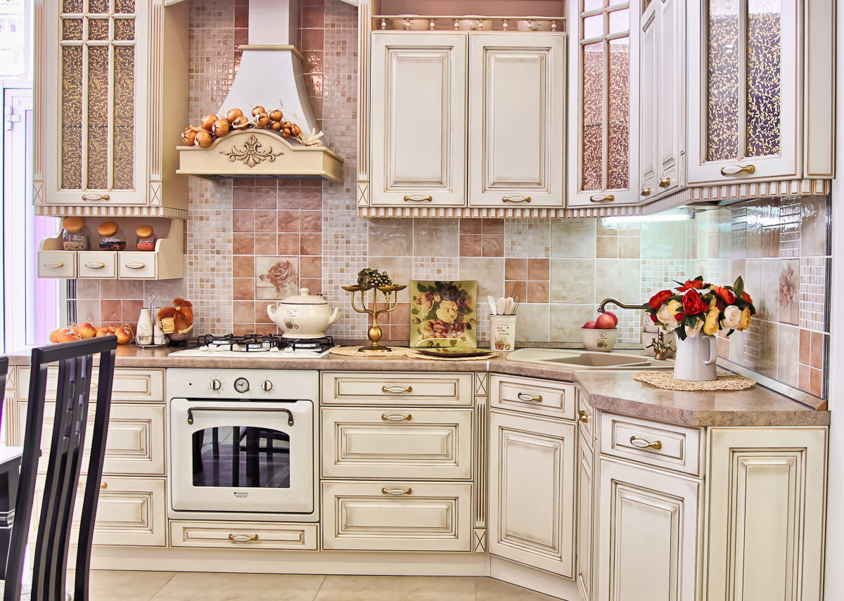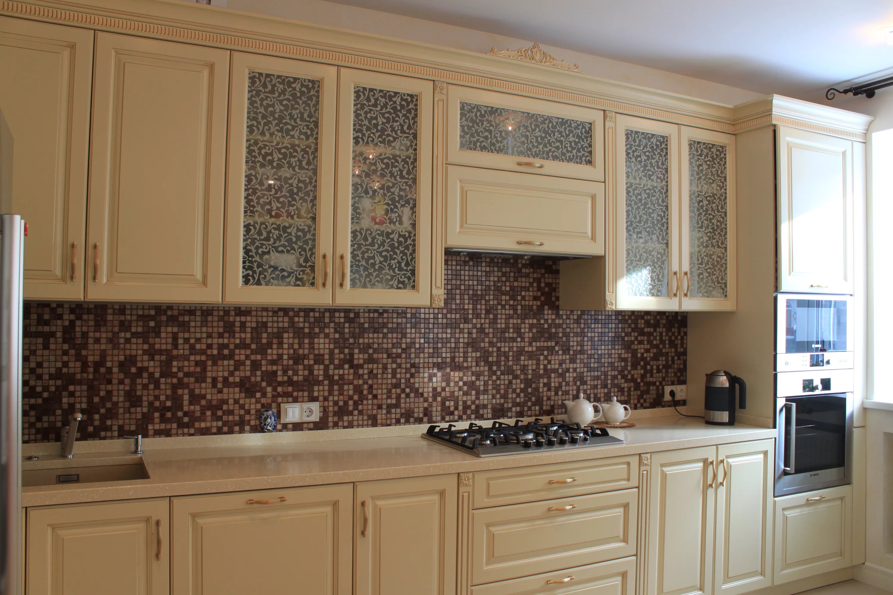 An apron made of glass (it is called “skinali”) looks very modern. In practicality and ease of care, it surpasses all other options! It can easily fit into the classic style of the kitchen. It can be monochromatic frosted or glossy glass, illuminated glass, printed glass. Figure must be selected on the basis of the general concept of design. These can be flowers, landscapes, large photos of products or spices, “aged” and retro pictures, written inscriptions, etc. To make your kitchen in a classic style unique, you can make skinali with your own photos or other images that are dear to you personally.