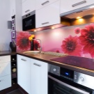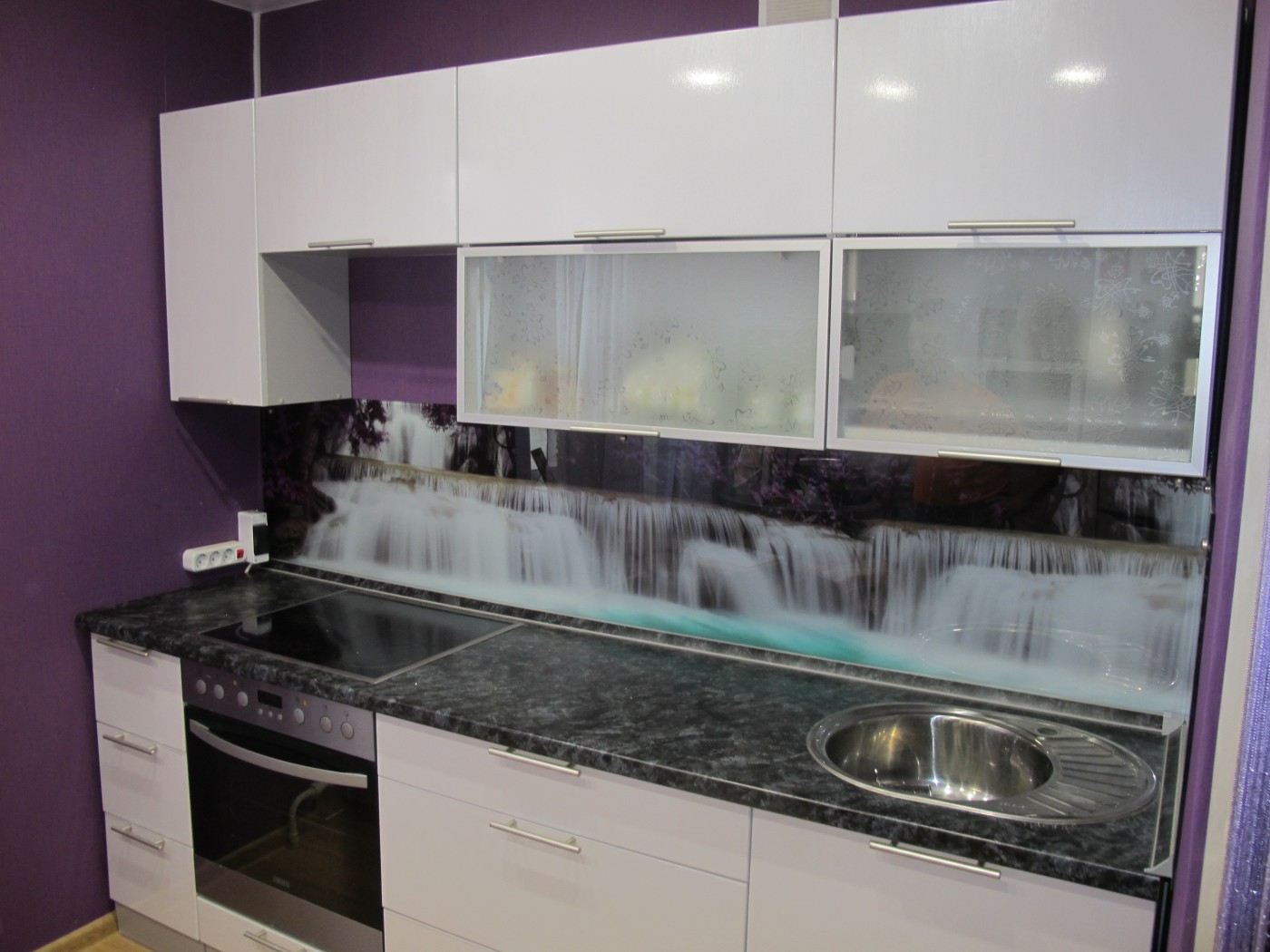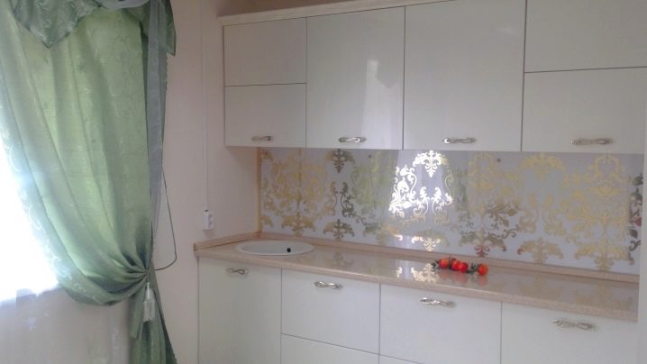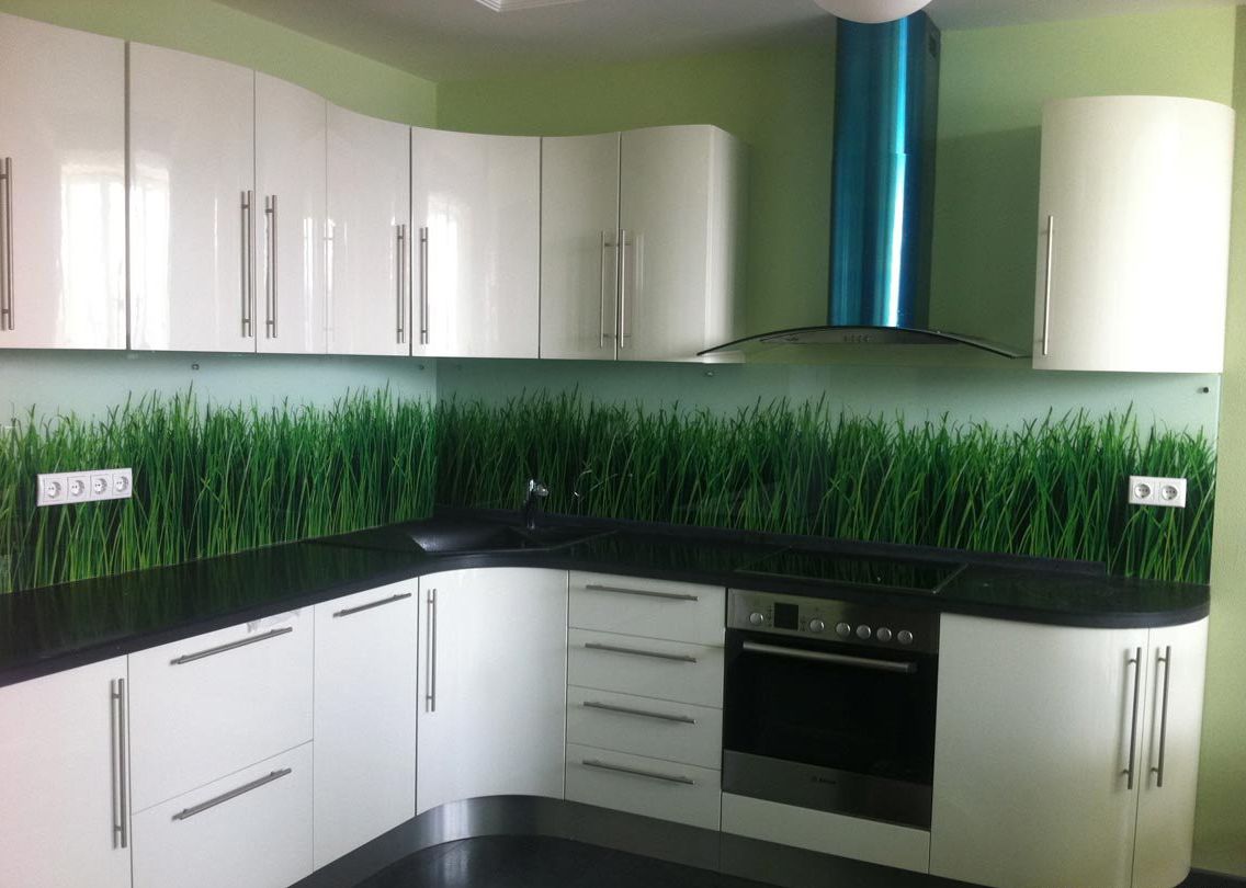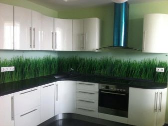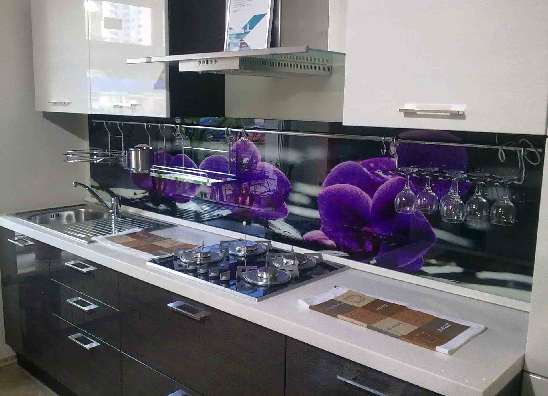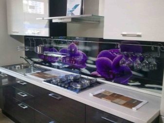 A good option for arranging the kitchen is a false panel made of glass. The main advantage of the material is a presentable appearance, but the cost of finishing is slightly higher in comparison with chipboard and MDF surfaces.Due to this complex creation technology. Glass belongs to environmentally friendly materials, the panel is unpretentious in leaving. Surfaces with photo printing at the base look quite stylish and modern.