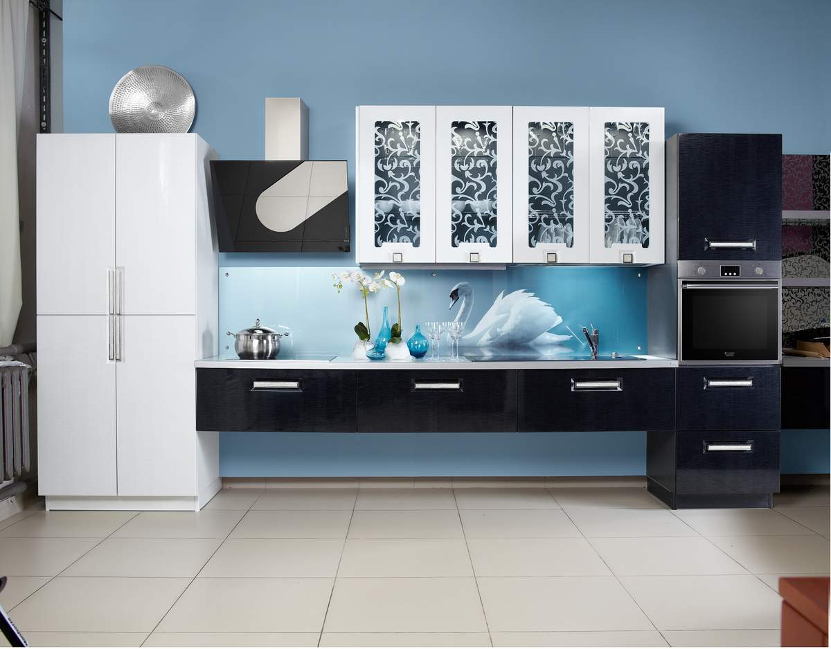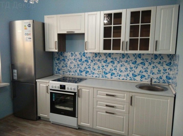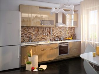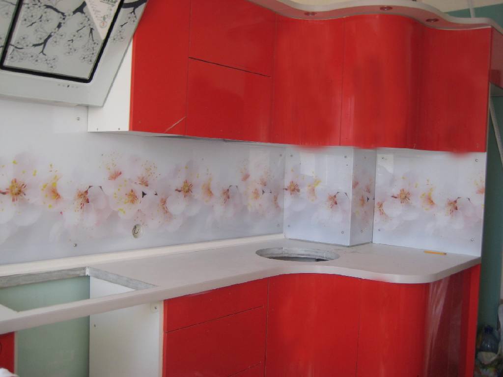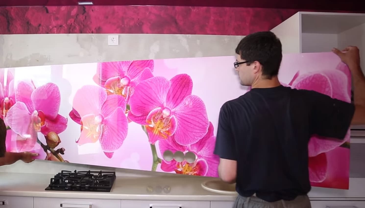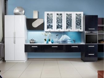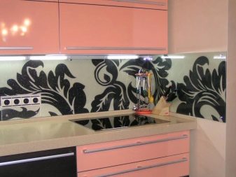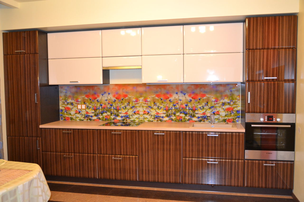 A good option for arranging the kitchen is a false panel made of glass. The main advantage of the material is a presentable appearance, but the cost of finishing is slightly higher in comparison with chipboard and MDF surfaces.Due to this complex creation technology. Glass belongs to environmentally friendly materials, the panel is unpretentious in leaving. Surfaces with photo printing at the base look quite stylish and modern.