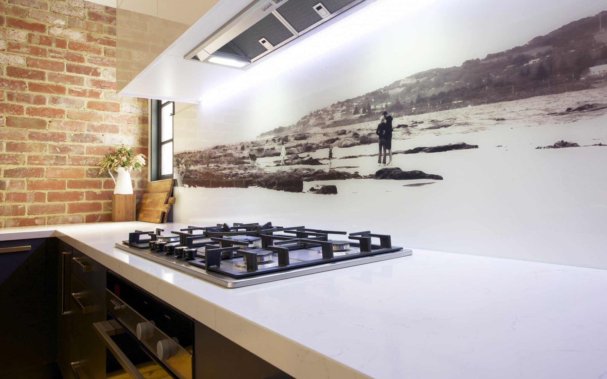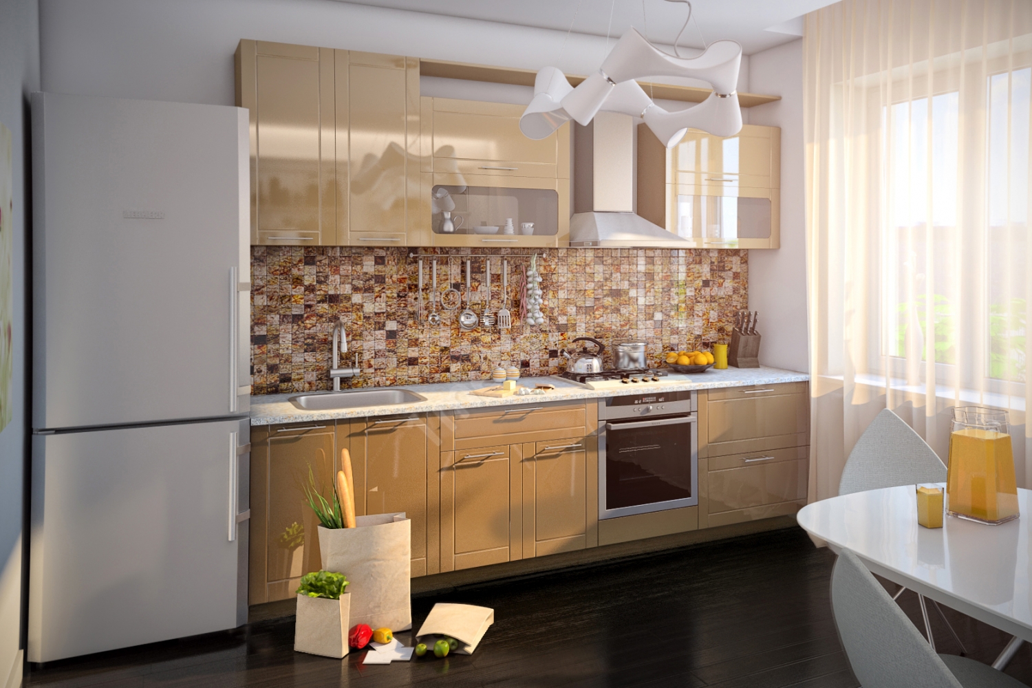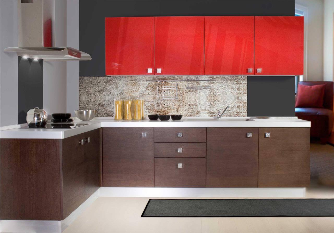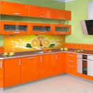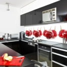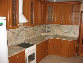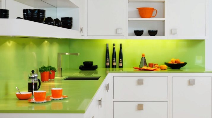 A good option for arranging the kitchen is a false panel made of glass. The main advantage of the material is a presentable appearance, but the cost of finishing is slightly higher in comparison with chipboard and MDF surfaces.Due to this complex creation technology. Glass belongs to environmentally friendly materials, the panel is unpretentious in leaving. Surfaces with photo printing at the base look quite stylish and modern.