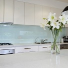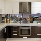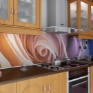 Glitter glass will give the kitchen a neatness in any light. It is believed that glass, as well as models of laminate - the most noble type of finish, always looks laconic, expensive, prestigious. When mounting, it is better to use fasteners.You will not scratch headsets, facades, so the repair and finishing work can be carried out at any stage of construction. Equally popular will be the mirror apron, correcting all the flaws in the geometry of your kitchen.