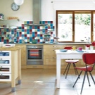 One of the most popular materials is a ceramic tile or a small format porcelain tile.They are available in price and quality, but more expensive than the option of chipboard, MDF. An order of magnitude higher are the aprons of sustainable glass, artificial stone. The latter are used mainly in country cottages and apartments to maintain the prestige of their real estate.