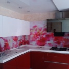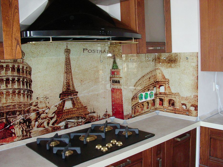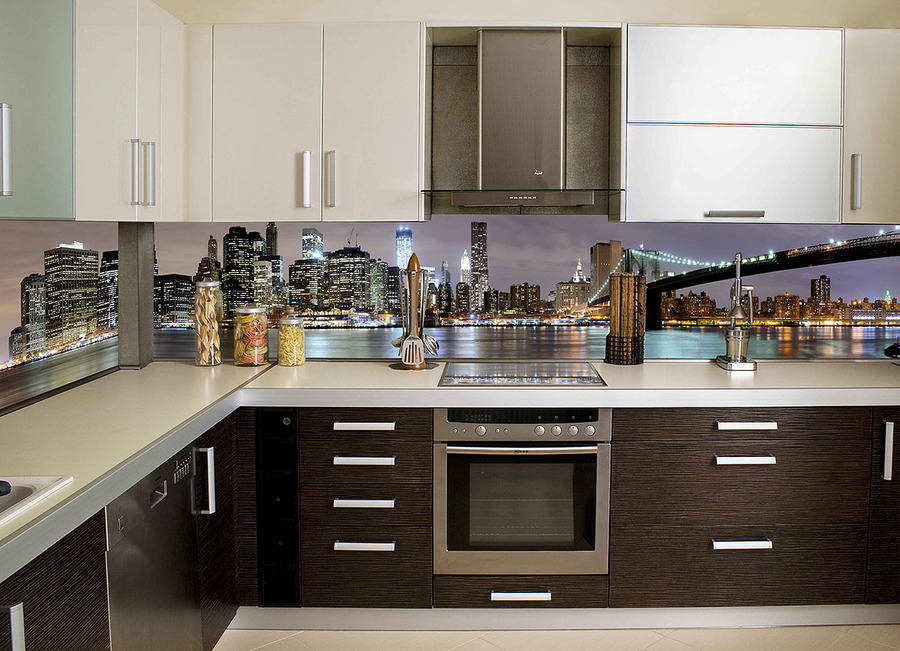 For modern hi-tech, constructivism, avant-garde, it is better to use tempered glass with the image of a black and white city, landscapes, portraits, etc. Here you can also use full-color UV printing on glass, vinyl film with a pattern, triplex technology, matting, etc. styles are also suitable kitchen apron made of metal. Get a sort of fusion with a perfectly smooth surface, glossy shine.