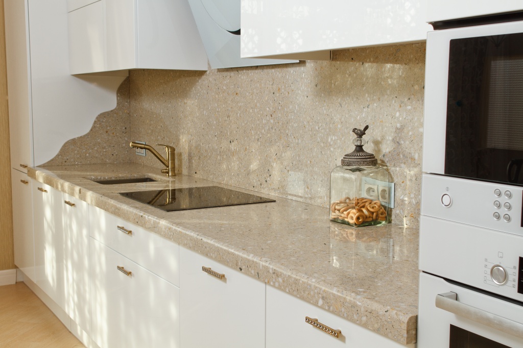 One of the most aesthetically attractive ideas will be the use of artificial stone. In this case, it is better that the tabletop was framed from the same material. Despite its high cost, decoration is very popular among wealthy owners of cottages, penthouses, townhouses.