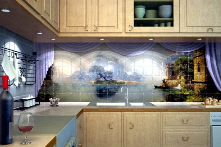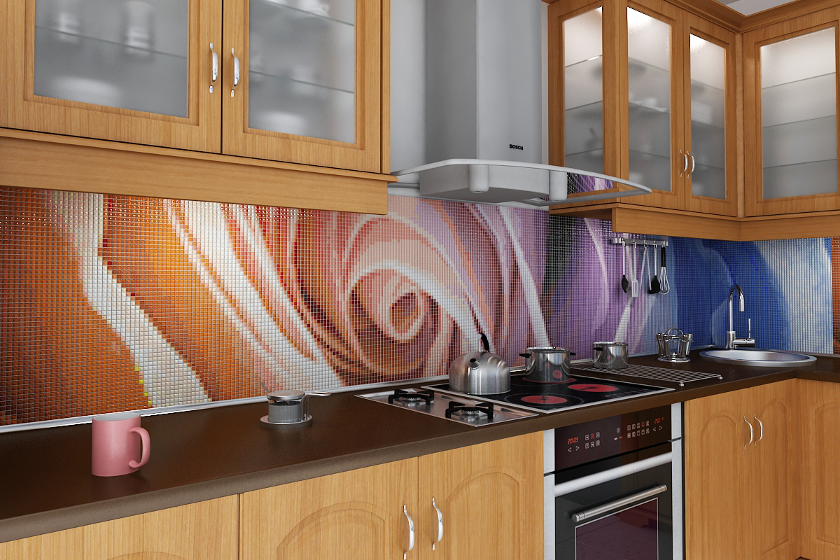 The apron made with the participation of photo tiles looks unusually fashionable.It will become a unique decoration for the kitchen, will add individuality, luxury to any interior. You can paint absolutely any print, pattern or design, even your family photo, above the hob. Such a decoration will certainly inspire you to cook delicious, mouth-watering dishes for your favorite household.