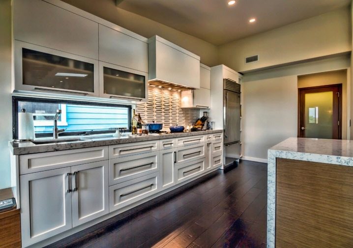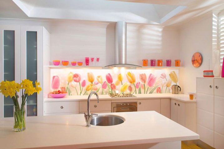It can be a seashore, a fascinating horizon line, flower still lifes, fantasy scenes, animal paintings or any national pattern (Scandinavian, Oriental, Provencal, Azulezhu, etc.). The universal color for the apron is still considered white.Plastic panels, glass will look great with a headset of any color. In order for them not to have a “sick” dull look, designers advise to dilute the snow-white tonality with a color insert from a mosaic, a ceramic decor, a photo printing. The neutral gamut also includes ayvori shade, beige, ivory, milky, cream.