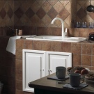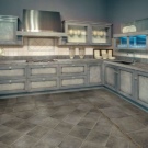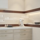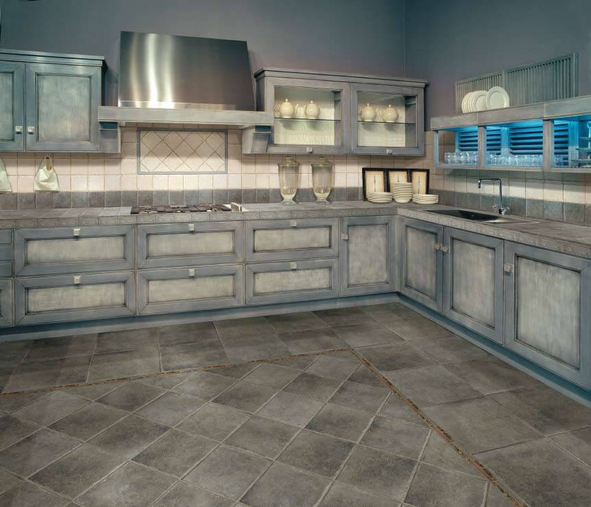 Satin finish. It contains mineral salts.Its microporous surface prevents the growth of microbes and bacteria, which is very important for rooms where food is cooked. This sort of porcelain stoneware is obtained by depositing minerals with different melting points on the surface before the final roasting. Unlike polished tiles, satin porcelain stoneware does not slip, which makes it possible to use it not only for finishing the working surface of the kitchen, but also for laying the floor.