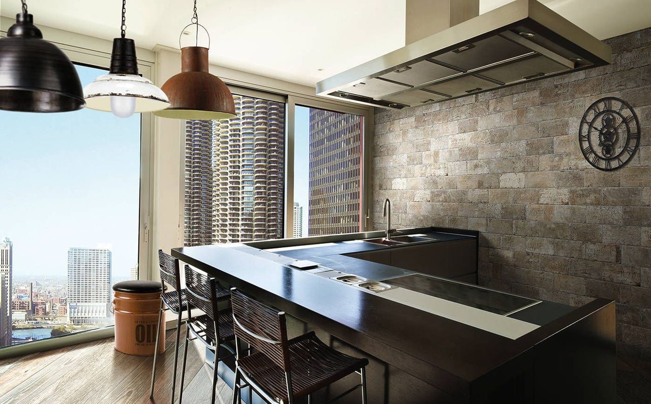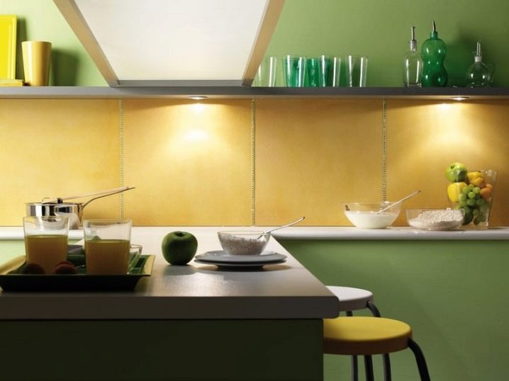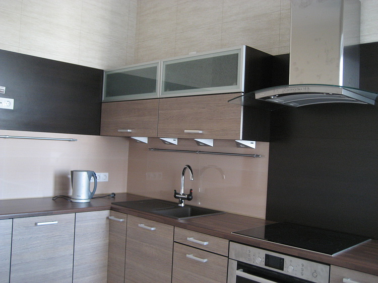This material is very heavy. If ceramic tiles can be put only on the wall between the upper and lower cabinets, then it is advisable to lay out the entire wall from the ceiling to the upper cabinets with ceramic granite so that the lower layer supports the subsequent upper one. Or it is necessary to pre-attach the metal guide, which will support the tile.