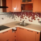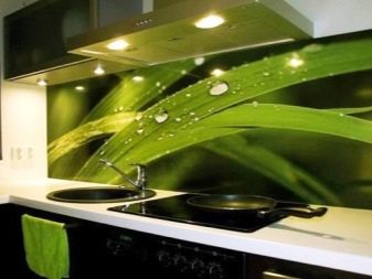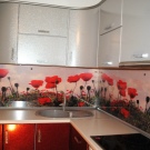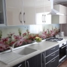 Polycarbonate is also called acrylic glass. It is used to finish the kitchen, as this material washes easily, does not allow mold fungi to multiply and is easily mounted. Polycarbonate skins are decorated with photo printing films, they can be used for about 5 years, until the drawing fades. In the future, such an apron can be easily replaced with a new one, without bothering itself with significant expenses.