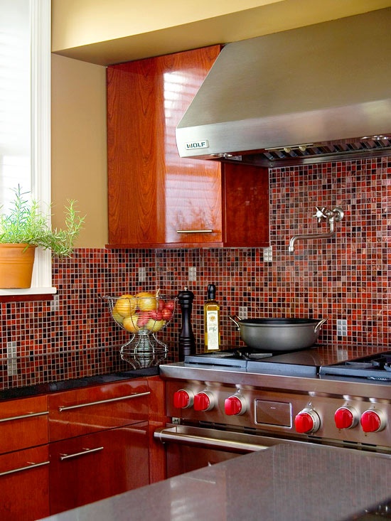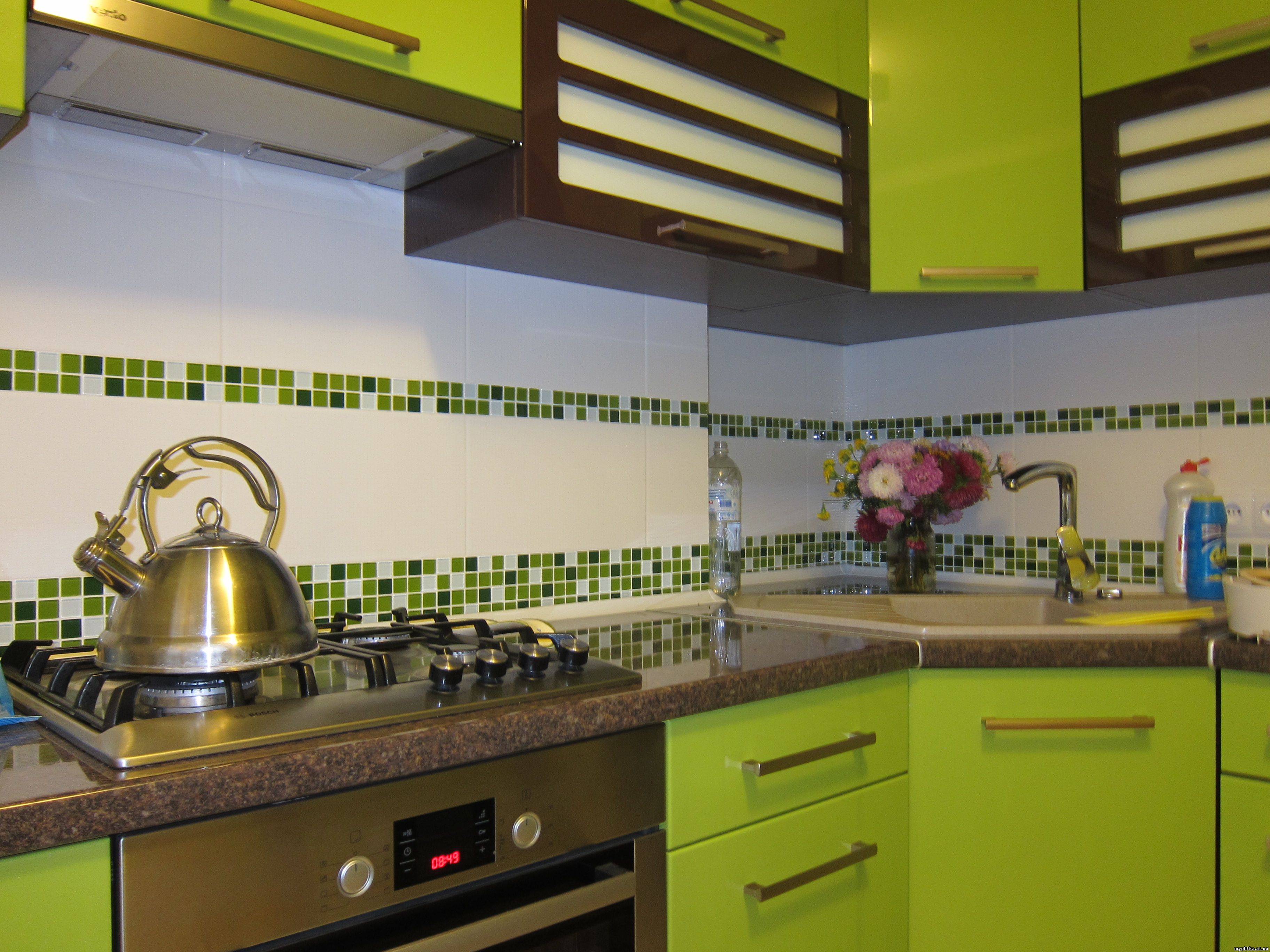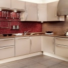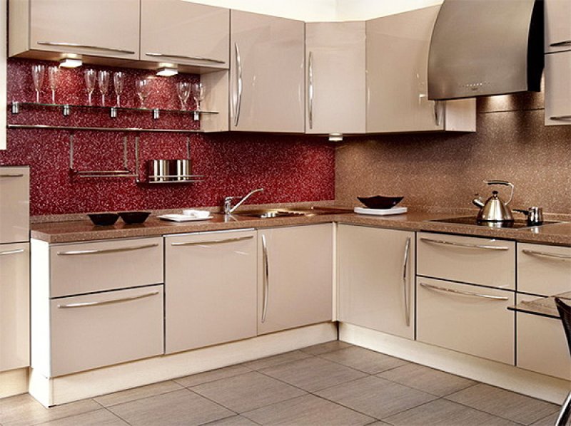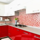 Adherents of kitchen decoration tiles can choose glossy or matte surfaces for almost any color of furniture. For a spectacular red - black kitchen or for a tender salad kitchen, as well as for a chocolate kitchen, you can decorate an apron of tiles with bas-reliefs, rhombuses or mosaic patterns.