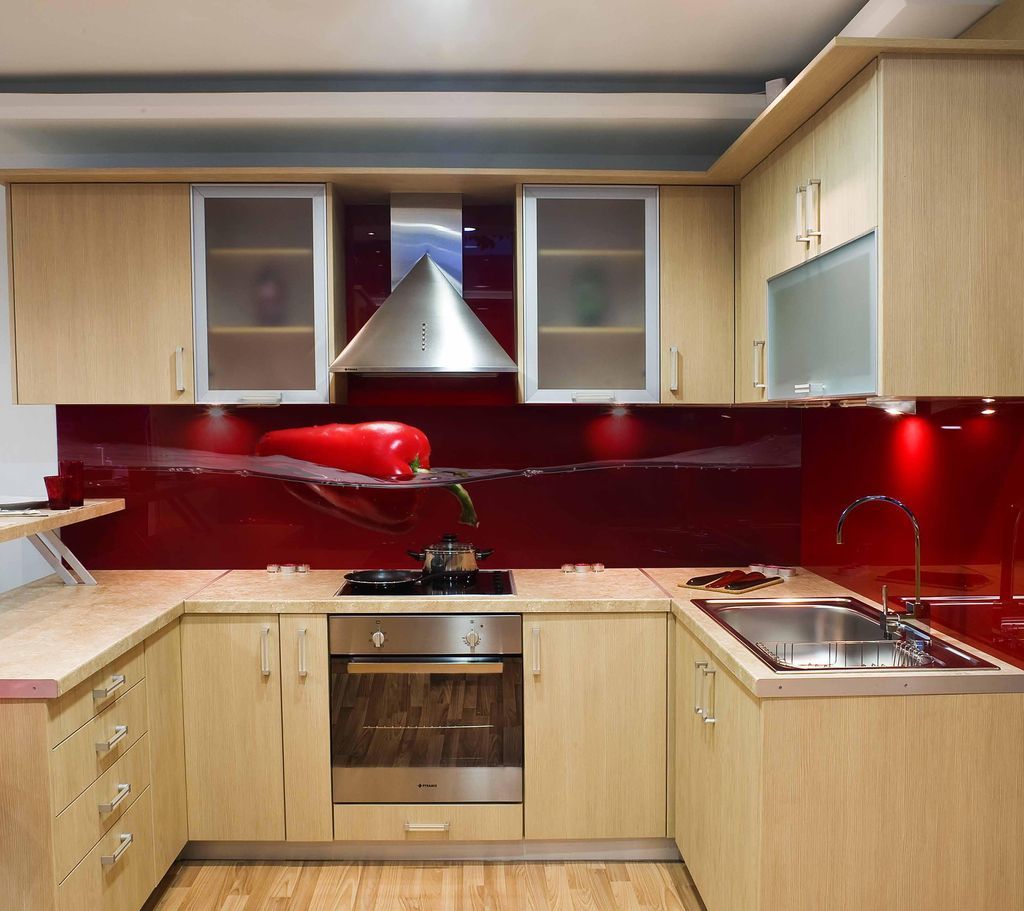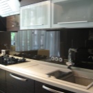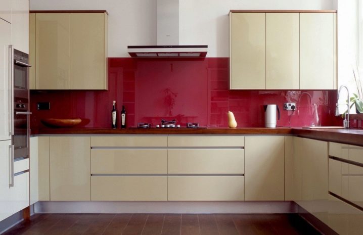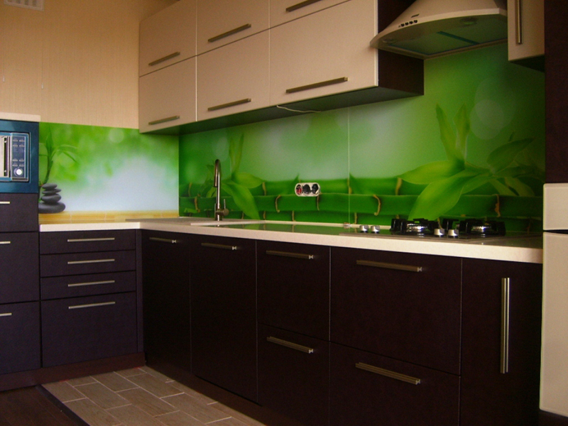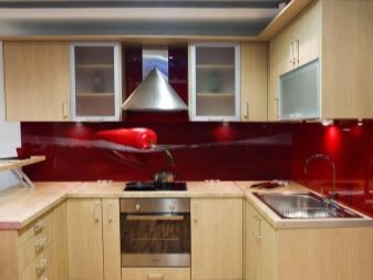 Custom properties of glass are not inferior to the qualities of ceramic tiles. It does not tarnish and is not afraid of moisture. Glass panels do not have joints and seams, the options of tempered glass are not deformed by the heat of the gas stove.