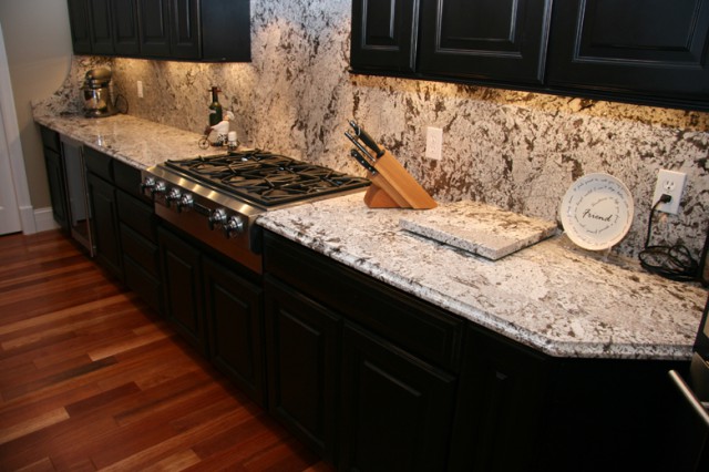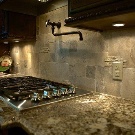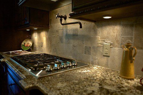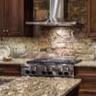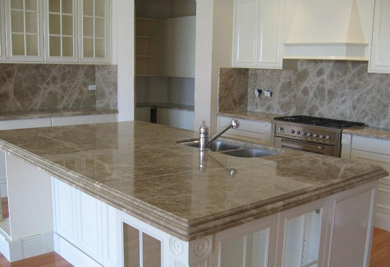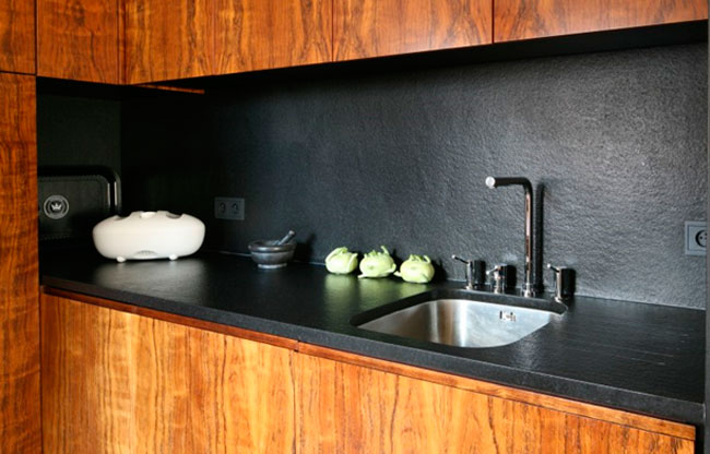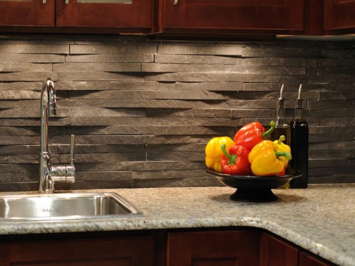 Huge possibilities of choice provide natural natural shades of stone, such as granite, marble, basalt, travertine, slate or onyx. Usually tile made of natural stone is installed in a set with a table top. The exception is the use of tiles that mimic a brick wall. The “brick” wall is usually supplemented with a stone-tops tone.