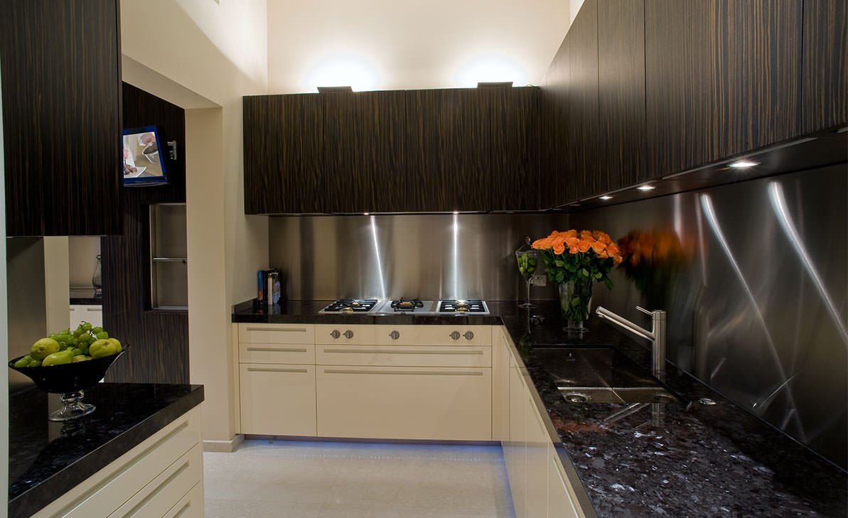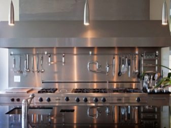 Stainless steel is a durable material that endures temperature changes, is resistant to water damage and allows the use of any chemical detergents. Stainless steel metal kitchen apron looks unique and goodfits into hi - tech space. It is fire resistant, and its considerable cost is reasonable. Aluminum or steel, such a stylish finish would be appropriate for the kitchen "techno", "minimalism", or "hi - tech", in which the main advantage is utility.