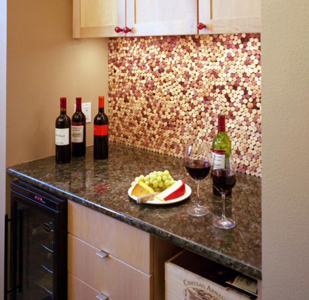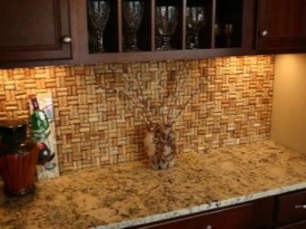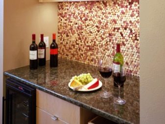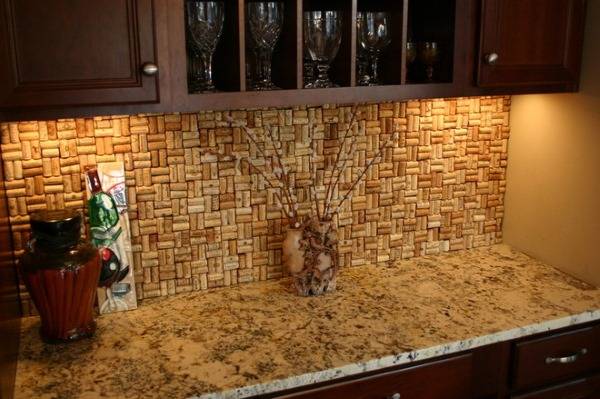 Other creative options are possible. For example, a kitchen apron from wine stoppers. In this case, the pattern is laid out in staggered order from traffic jams of the same size, cut in half. For the realization of such an idea, a special wax-plug for wall pasting is also suitable. Such an apron must be closed with glass to protect against water and dirt. This apron will be interesting to look complete with an artificial stone worktop.