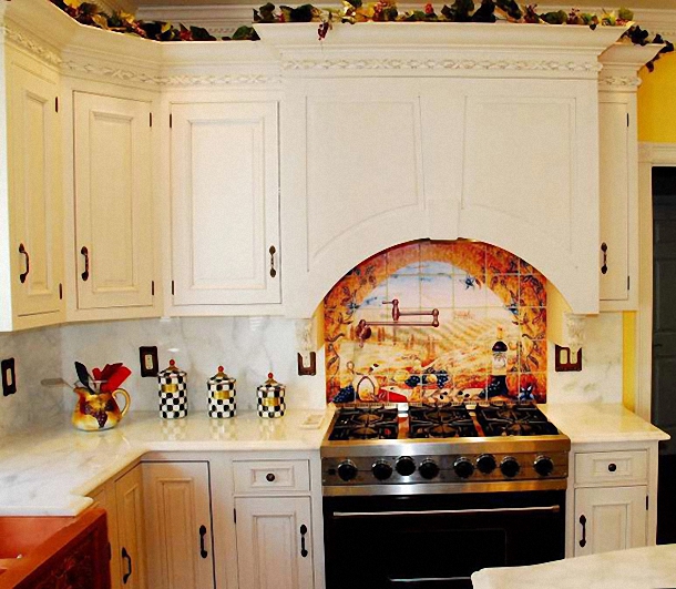 For a kitchen apron made of tile, the decoration will be a self-adhesive version of the vinyl film. This choice will suit the owners of the kitchen of classical design, who do not intend to search for an interesting decor for a long time, because such stickers are in a huge variety, ranging from paintings with images of the street to stickers with jokes. The luminous effect of such stickers is due to their luminescent properties, while these samples hold for a long time and are easy to clean.