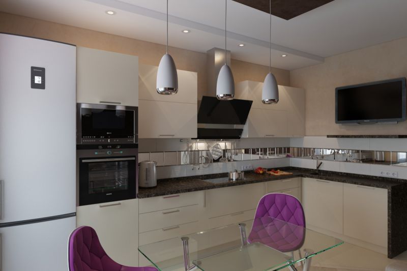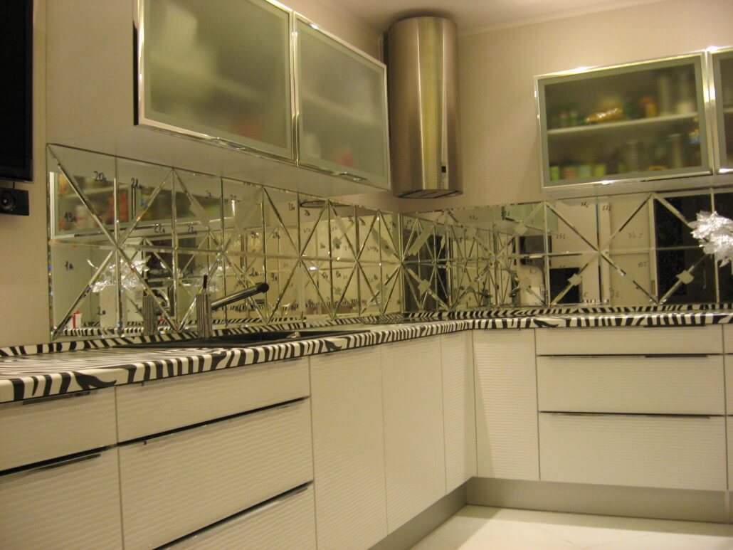 There are many different types of glass tiles and glass skins on the market, all of them are suitable for creating a kitchen apron. Glass tiles are made from whole glass. In some cases, coloring pigments are mixed to create color, and in other colors are painted on the back of clear glass. Plexiglas is the simplest and most inexpensive, and triplex is the most luxurious.