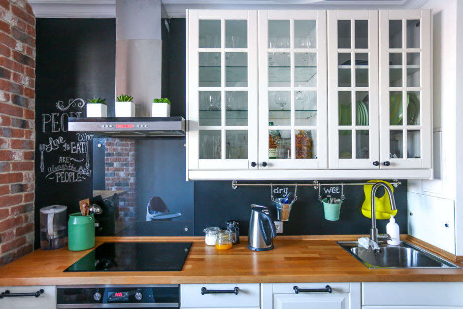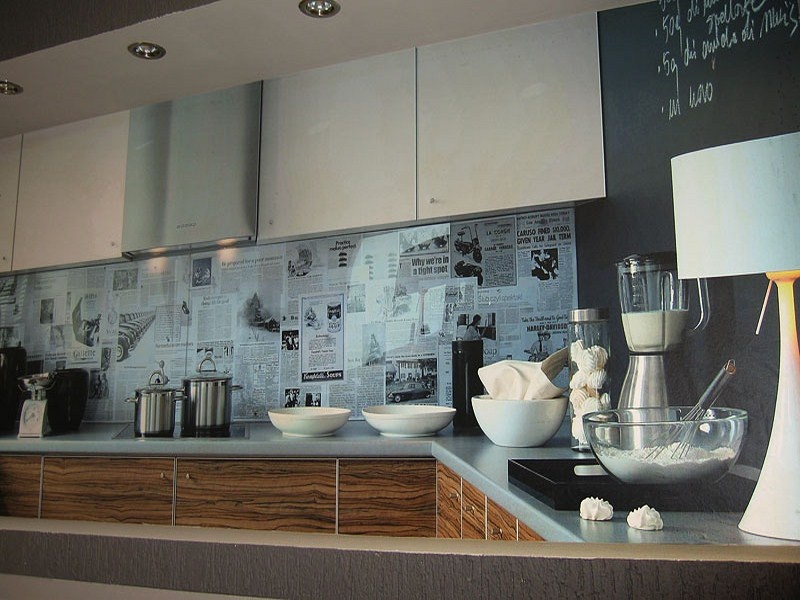 An even simpler option is to glue washable vinyl wallpaper into the gap between the cabinets. You can do this without even removing the old layer of wallpaper, if it holds tightly and does not exfoliate. In this case, the plinth and the corners will help protect the walls from leaking. You can make your own glass apron or its fragment. For this, a self-adhesive film or oilcloth is used instead of a film. It is fixed on the wall, forming a base, which can then be closed with acrylic or any other glass.