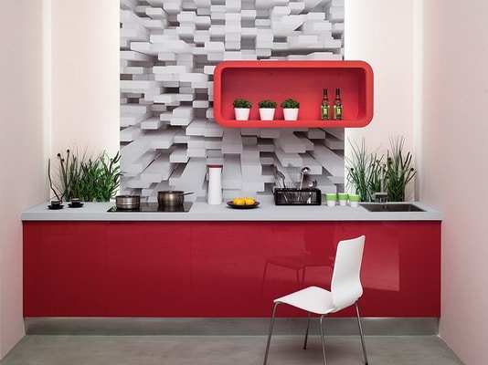 The use of stone is ideal for any kitchen style. It can blend harmoniously into the traditional or rustic look of the kitchen; but you can combine stone with more modern materials, for example, with bright red modular cabinets.